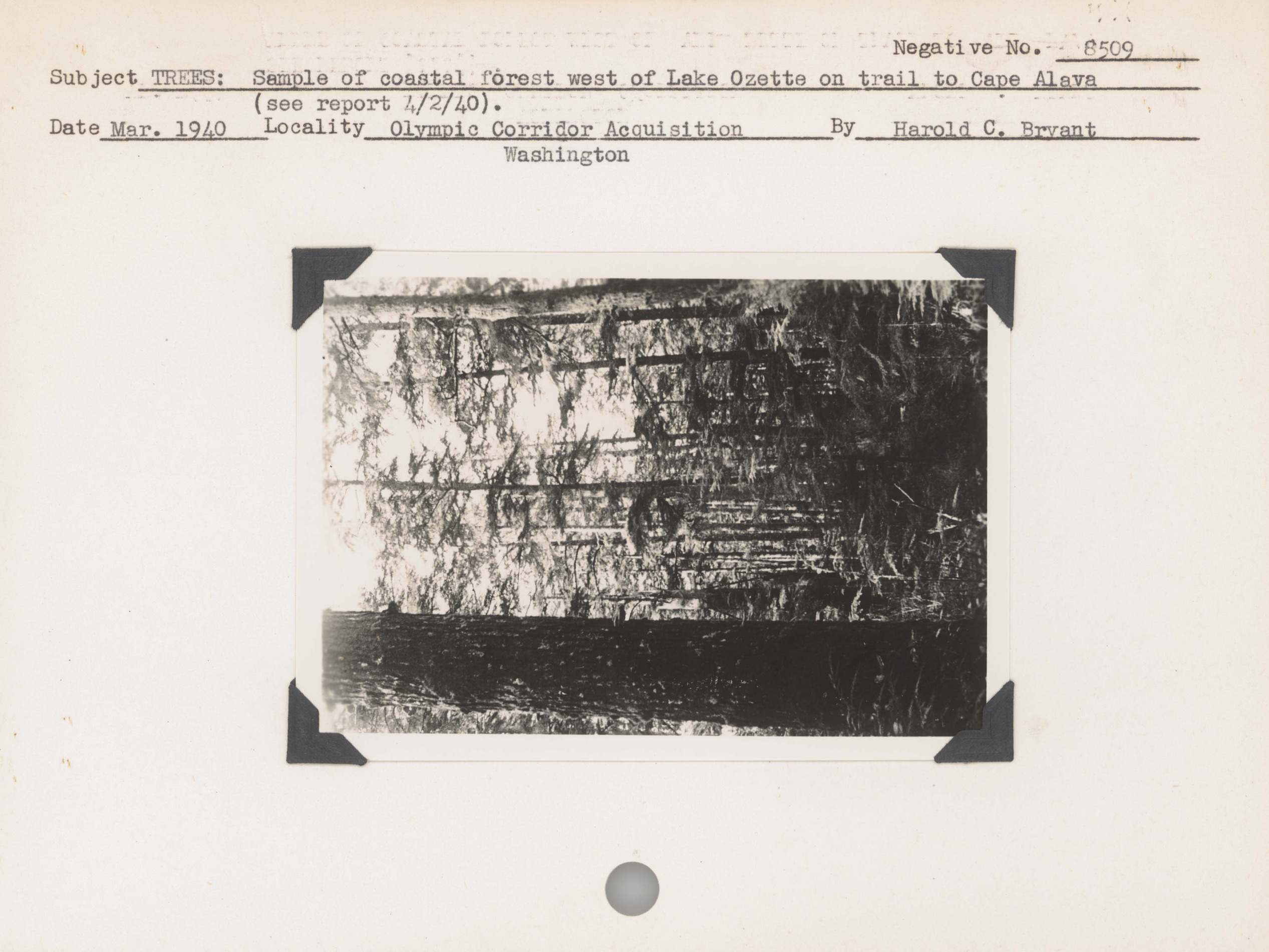 Trees: Sample of coastal forest west of Lake Ozette on trail to Cape Alava (see report 4/2/40). Negative #: 8509. Locality: Olympic Corridor Acquisition, Washington.
