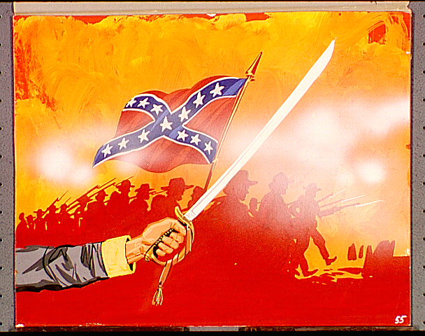 An arm extended holding a sword with a silhouette of troops under a Confederate Flag.