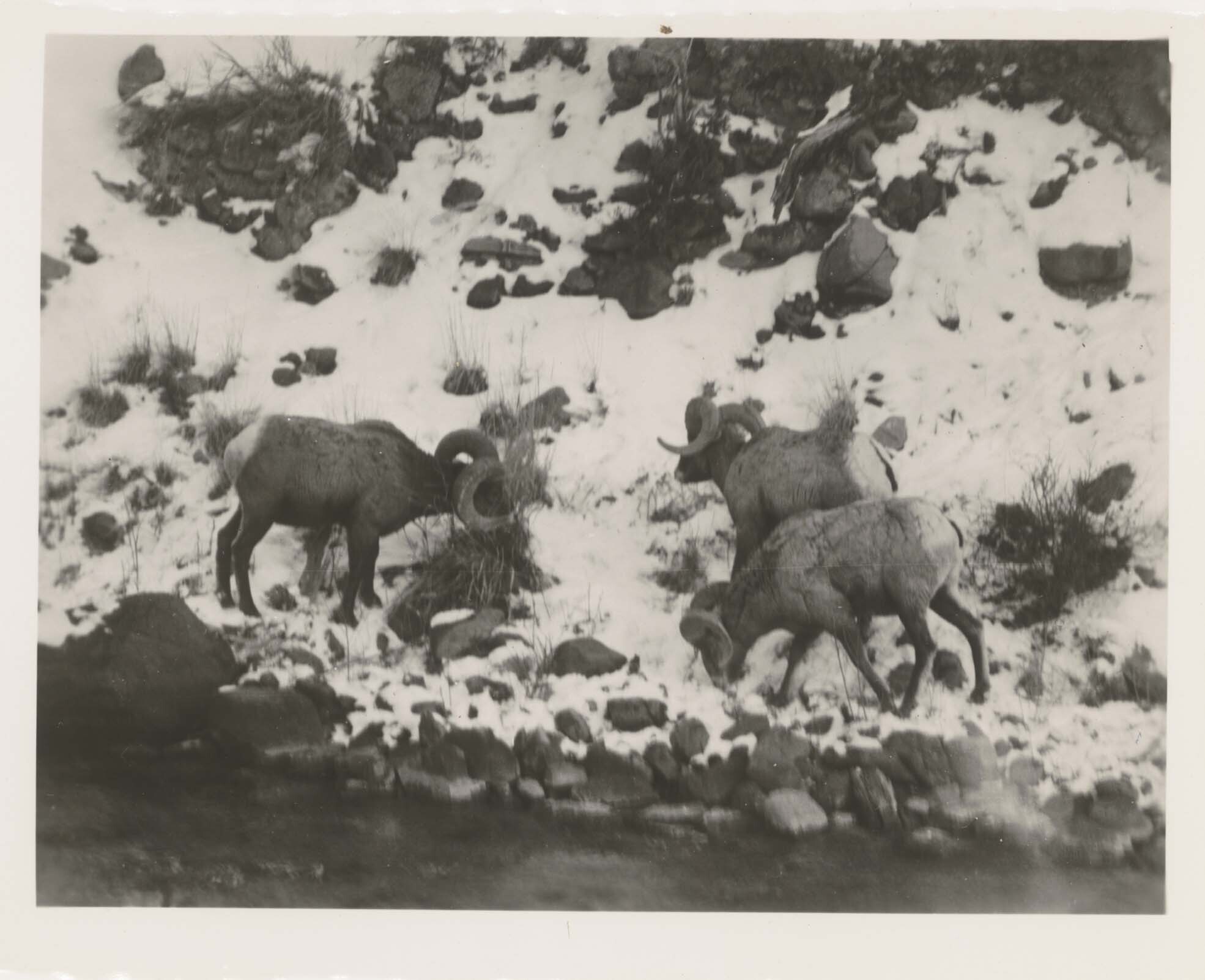 Mammals--Bighorn Sheep--Sheep, one feeding on rye grass. Locality: Gardiner River, Yellowstone National Park. Negative #: 8752