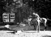 Ranger horseback patrol and visitors at recreational vehicle campground, Sequoia and Kings Canyon National Parks.