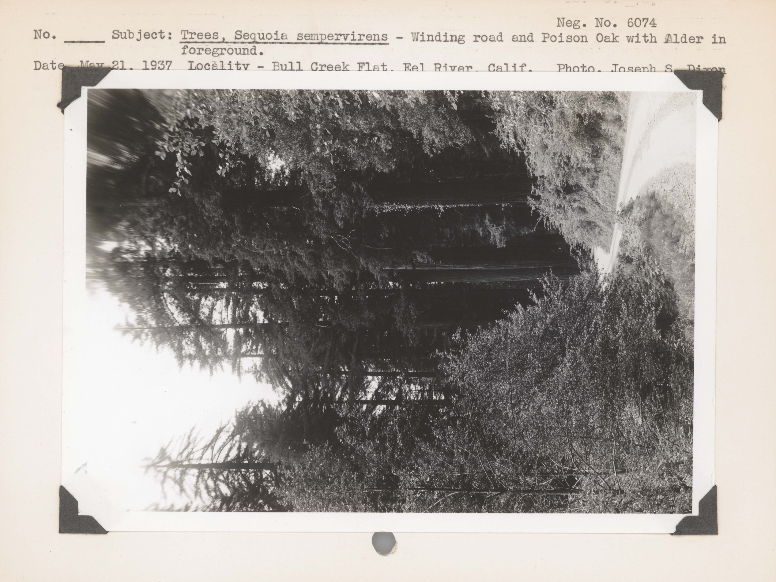 Tree – Sequoia sempervirens – Winding road and Poison Oak with Alder in foreground. Negative #: 6075. Locality: Bull Creek Flat, Eel River, California.