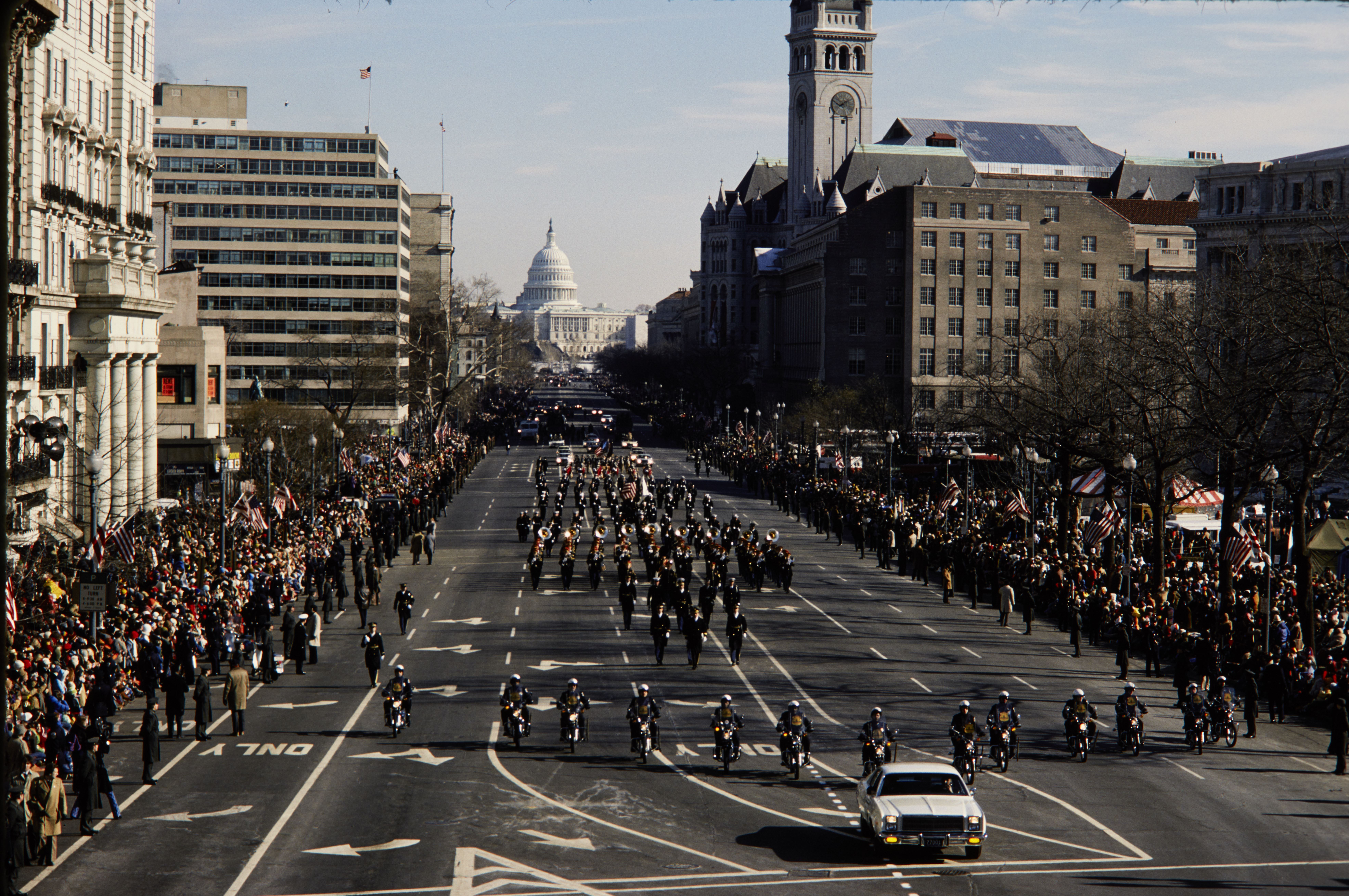 President Jimmy Carter's Inaugural Parade with a motorcycle pack in line behind a white car.