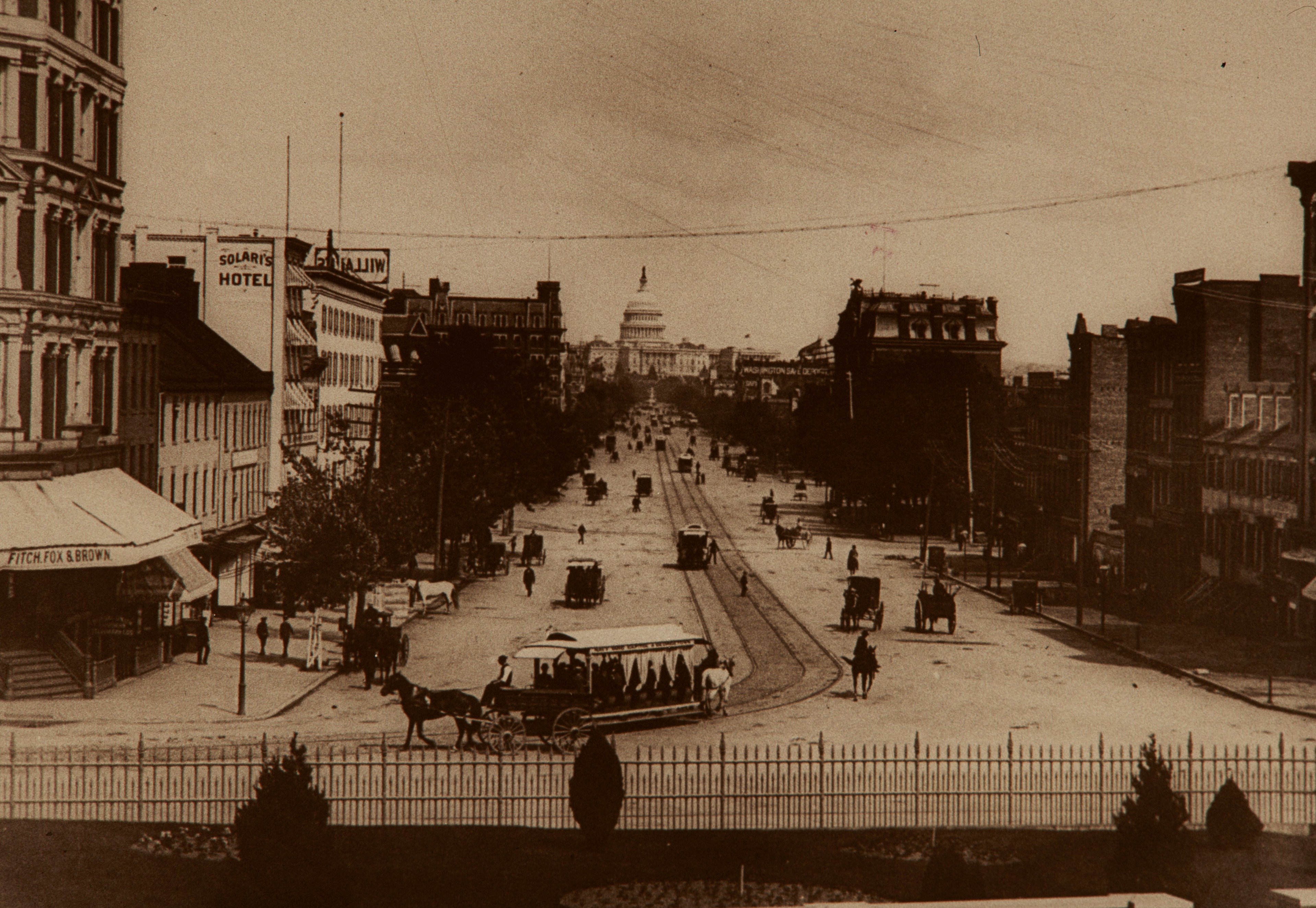 Horse pulled wagons going down a street in Washington, D. C. with the United States Capital in the background.
