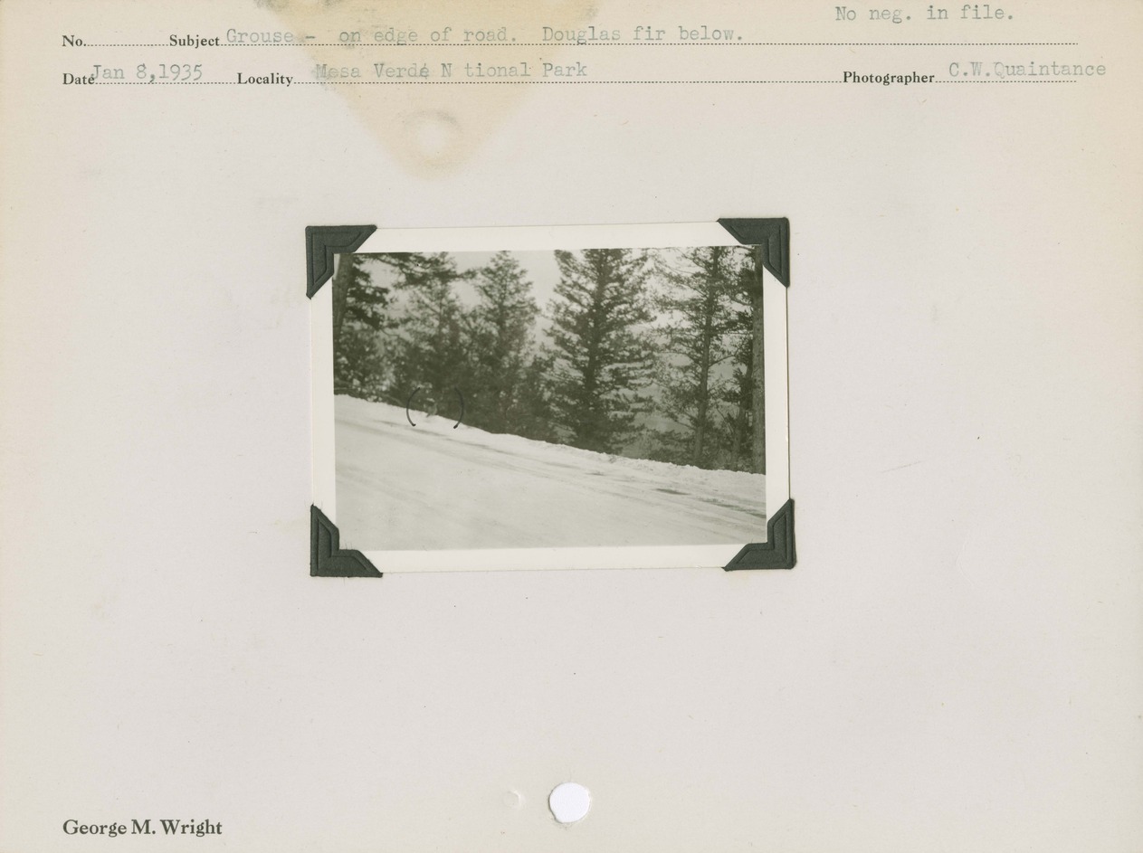 Grouse - on edge of road. Douglas fir below. Locality: Mesa Verde National Park. No negative on file.