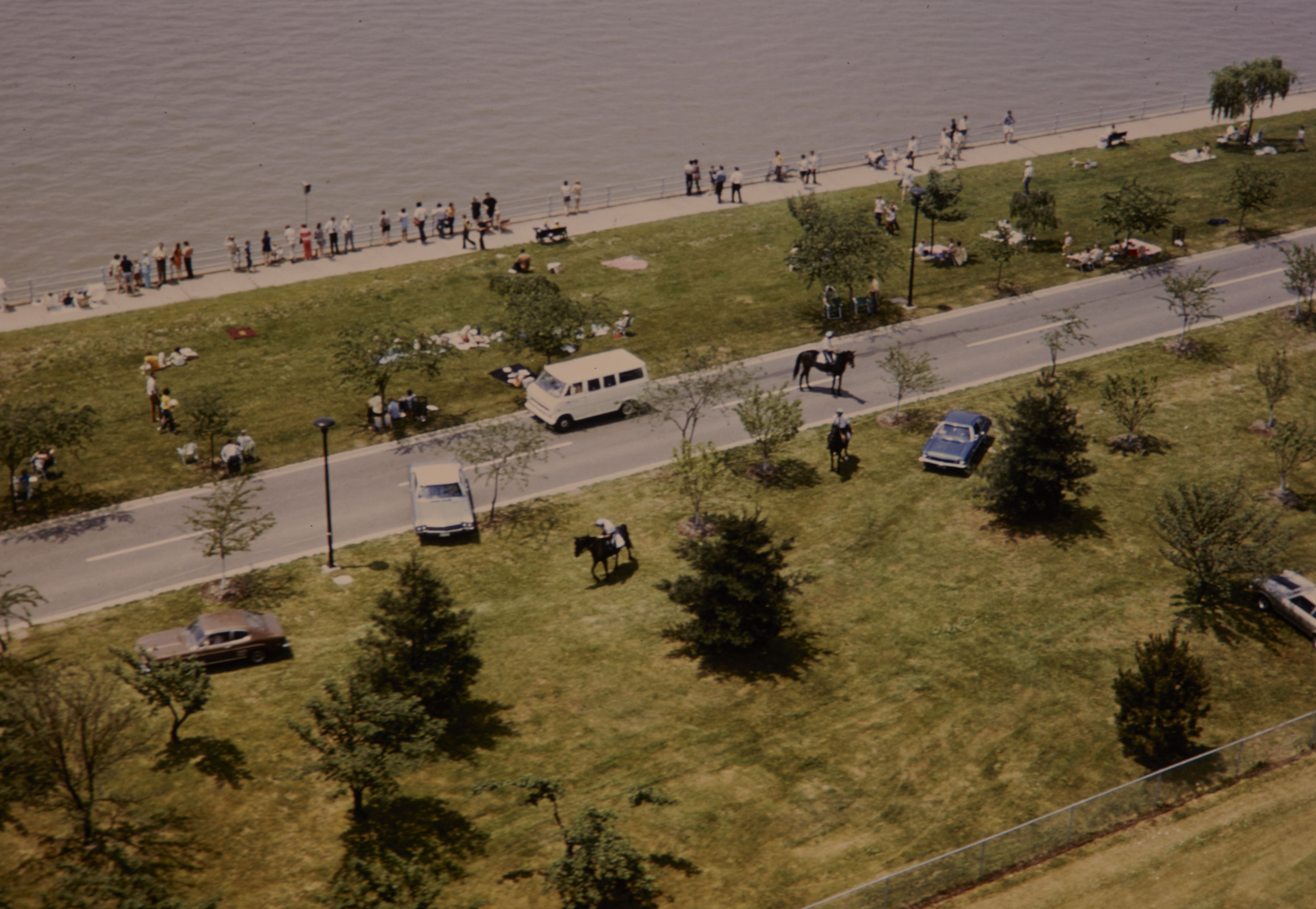 Aerial of visitors looking over into the river and a U.S. Park Police on horseback walking by in National Capital Parks.