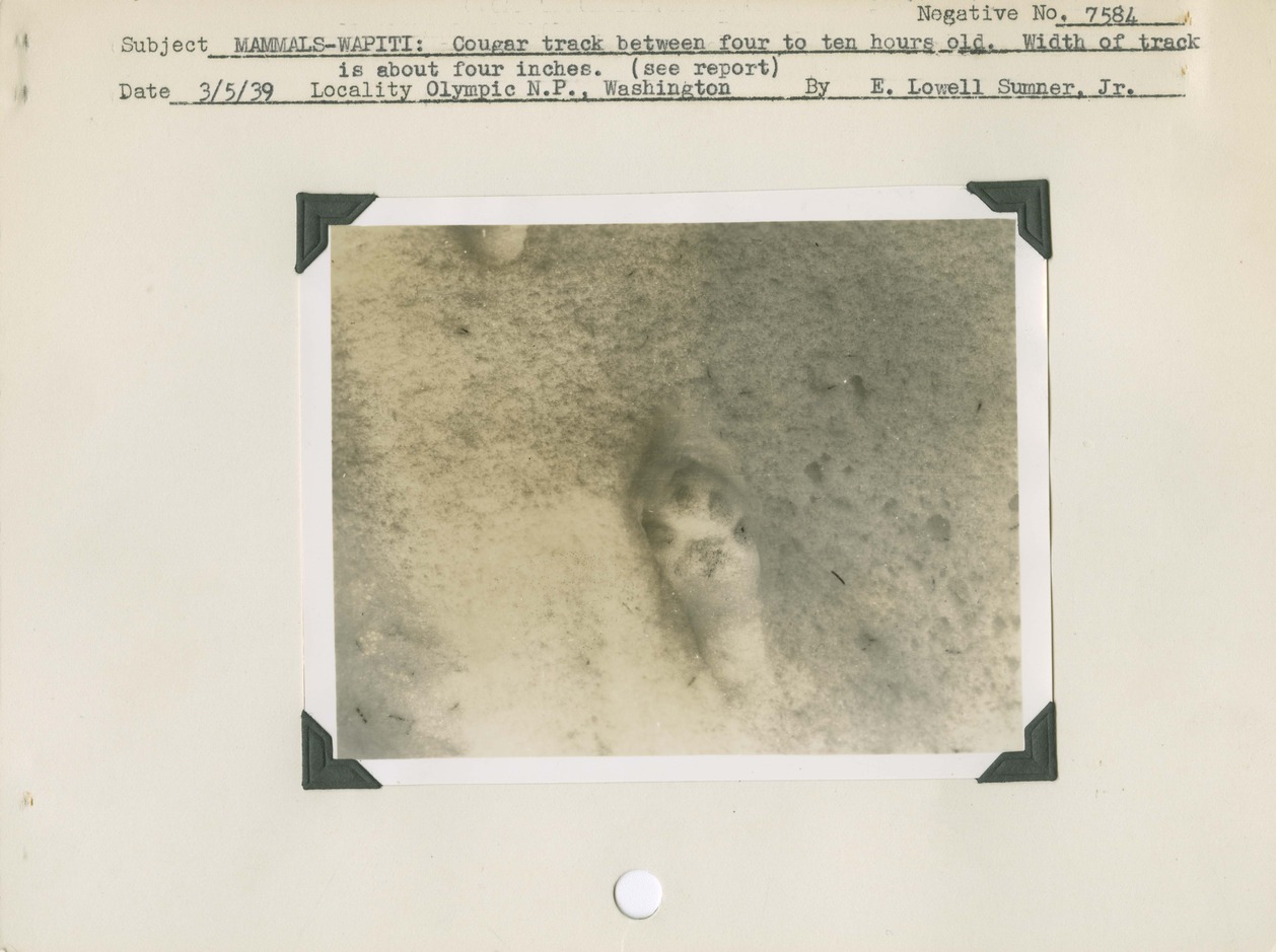 Mammals- Wapiti [Elk]: Cougar track between four to ten hours old. Width of track is about four inches. (See report). Negative #: 7584. Locality: Olympic National Park, Washington.