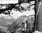 Hikers view the high country from the north rim, "Dewey Point", Yosemite National Park. Image dates to c. 1956.