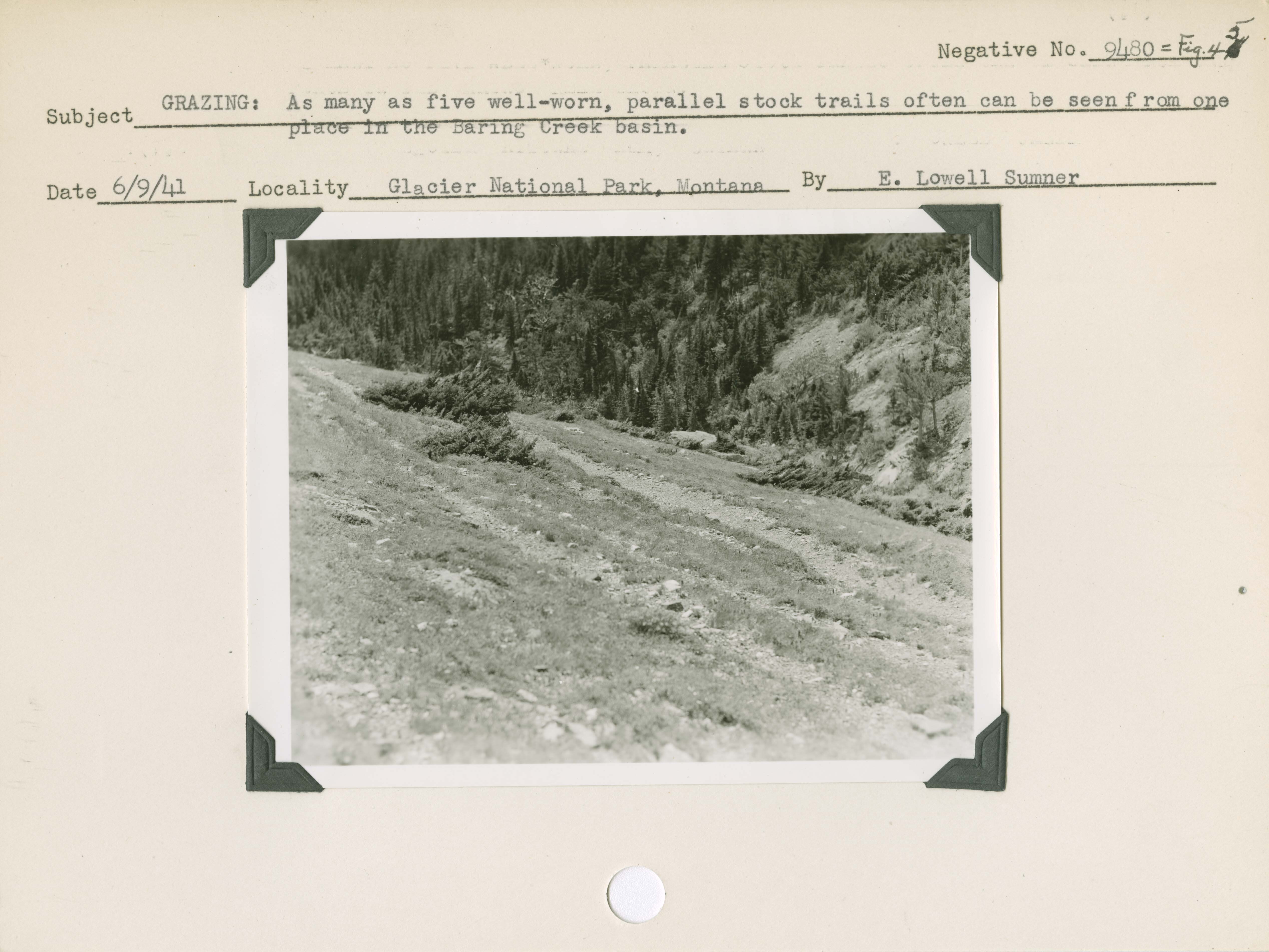 Grazing: As many as five well-worn, parallel stock trails often can be seen from one place in the Baring Creek basin. Locality: Glacier National Park. Negative #: 9480