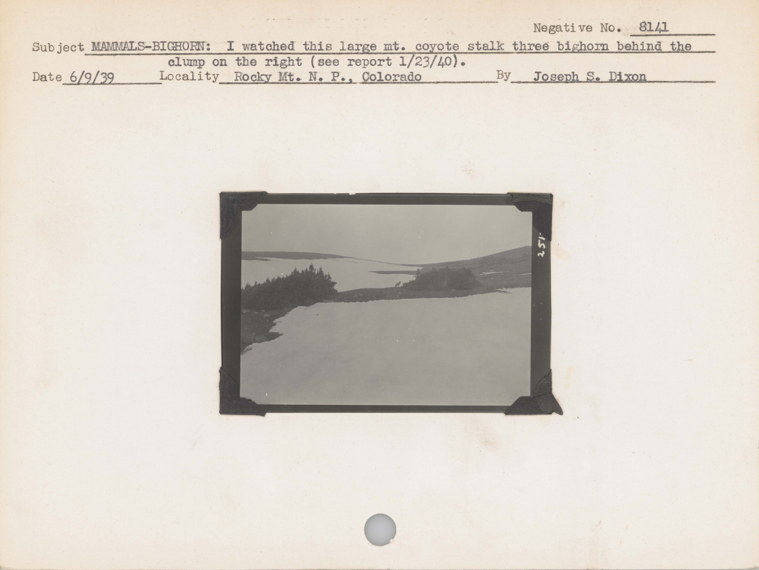 Mammals--Bighorn--I watched this large mountain coyote stalk three bighorn behind the clump on the right (see report 1/23/1940). Locality: Rocky Mountain National Park, Colorado. Negative #: 8141