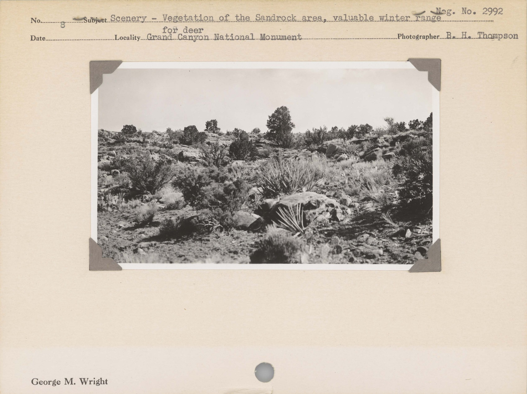 Scenery – Vegetation of the Sandrock area, valuable winter range for deer. (Figure 43) Fauna Number 2: Vegetation of the Sandrock area along brink of the inner gorge. This is valuable winter range for deer and mountain sheep. Negative #: 2992. Locality: Grand Canyon National Park. [This information comes from the reverse of the envelope for this negative #].