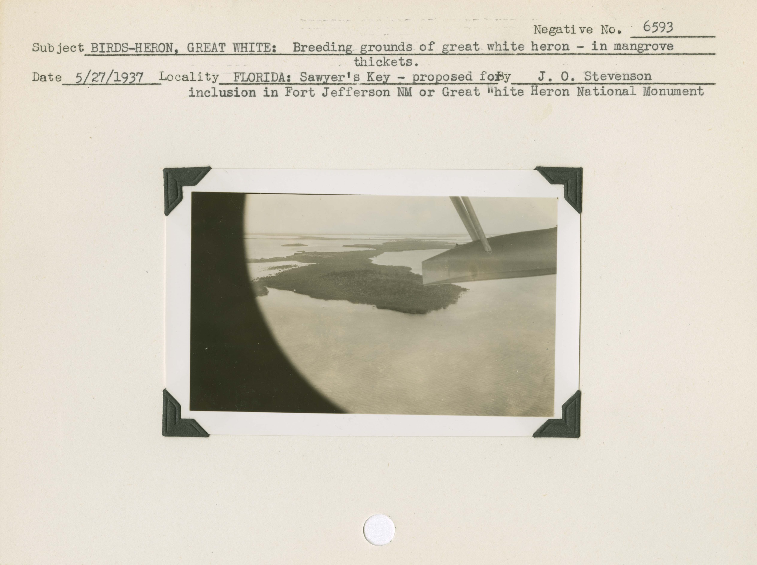 Birds- Heron, Great White: Breeding grounds of great white heron- in mangrove thickets. Locality: Florida: Sawyer's Key- proposed for inclusion in Fort Jefferson National Monument or Great White Heron National Monument. Negative #: 6593