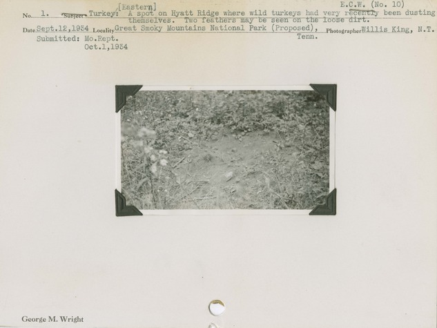 Turkey, Eastern: A spot on Hyatt Ridge where wild turkeys had very recently been dusting themselves. Two feathers may be seen on the loose dirt. Locality: Great Smoky Mountains National Park (Proposed), Tennessee. Negative #: ecw10. [The card also lists a 'Submitted: Monthly Report' date of 10-01-1934]