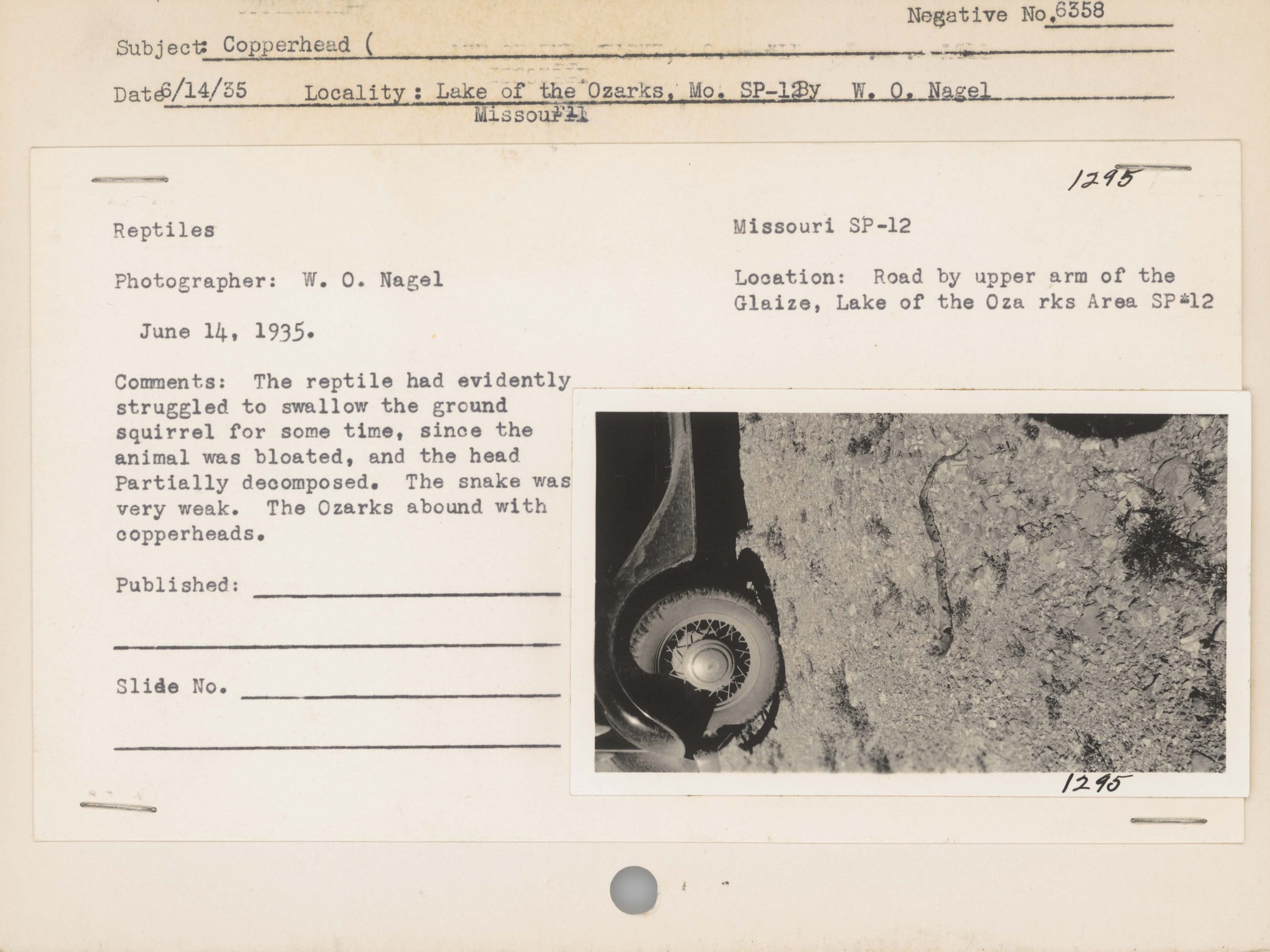 Copperhead. Locality: Lake of the Ozarks, Missouri, SP-12; Road by upper arm of Glaize, Lake of the Ozarks Area SP-12. Negative #: 6358. Comments: The reptile had evidently struggled to swallow the ground squirrel for some time, since the animal was bloated, and the head partially decomposed. The snake was very weak. The Ozarks abound with copperheads.