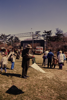 NPS employee holding a kite with visitors around him for Kite Day. Image Number 71-95-11.