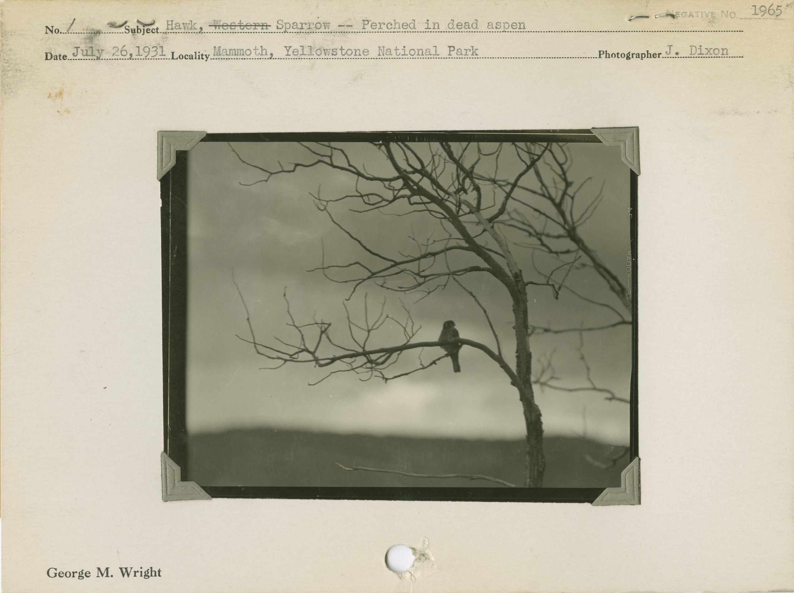 Hawk, Sparrow -- Perched in dead aspen. Locality: Mammoth, Yellowstone National Park. Negative #: 1965