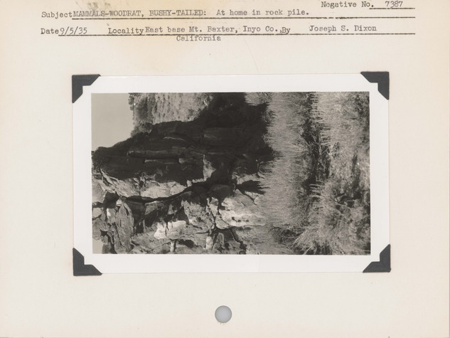Mammals--Woodrat, Bushy-Tailed--At home in rock pile. Locality: East base, Mount Baxter, Inyo County, California. Negative #: 7387