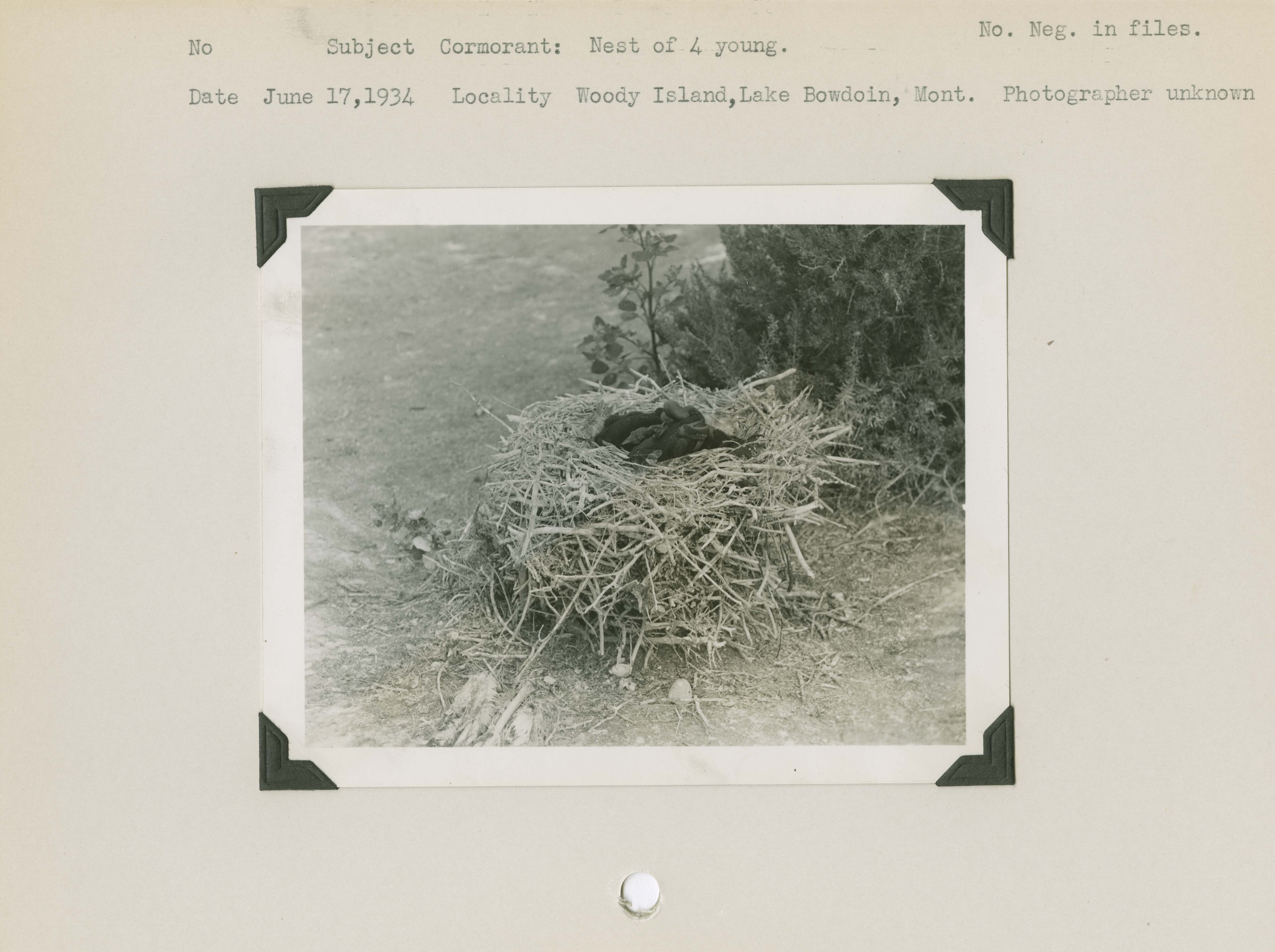 Cormorant: Nest of 4 young. Locality: Woody Island, Lake Bowdoin, Montana. No negative on file.