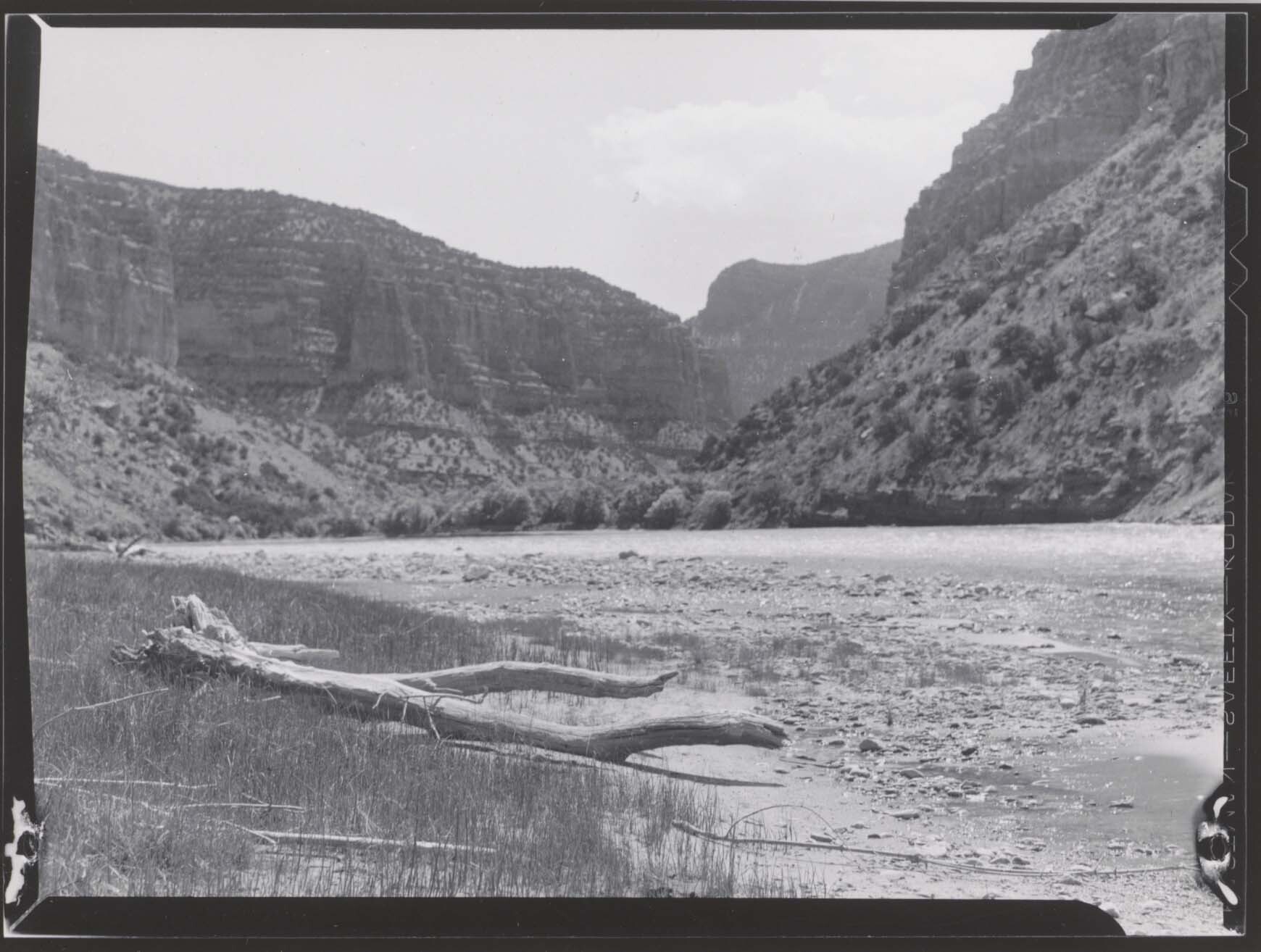 Up Green River from mouth of Jones Hole. Harpers Corner in right center. Negative #: 11108. Locality: Dinosaur National Monument. [This information comes from the reverse of the print for this negative #].