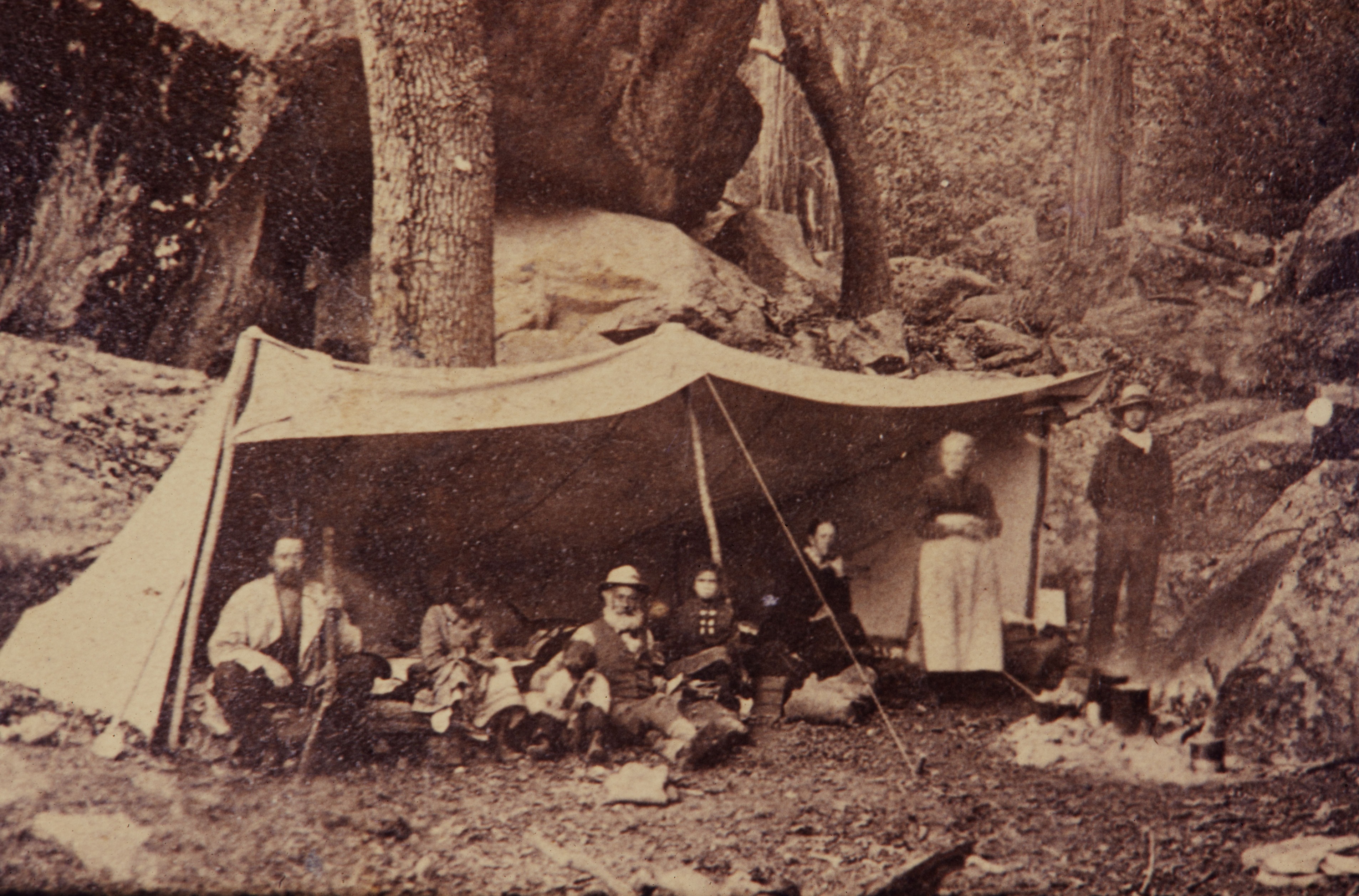 Visitors camping near nase of Yosemite Falls in Yosemite National Park.