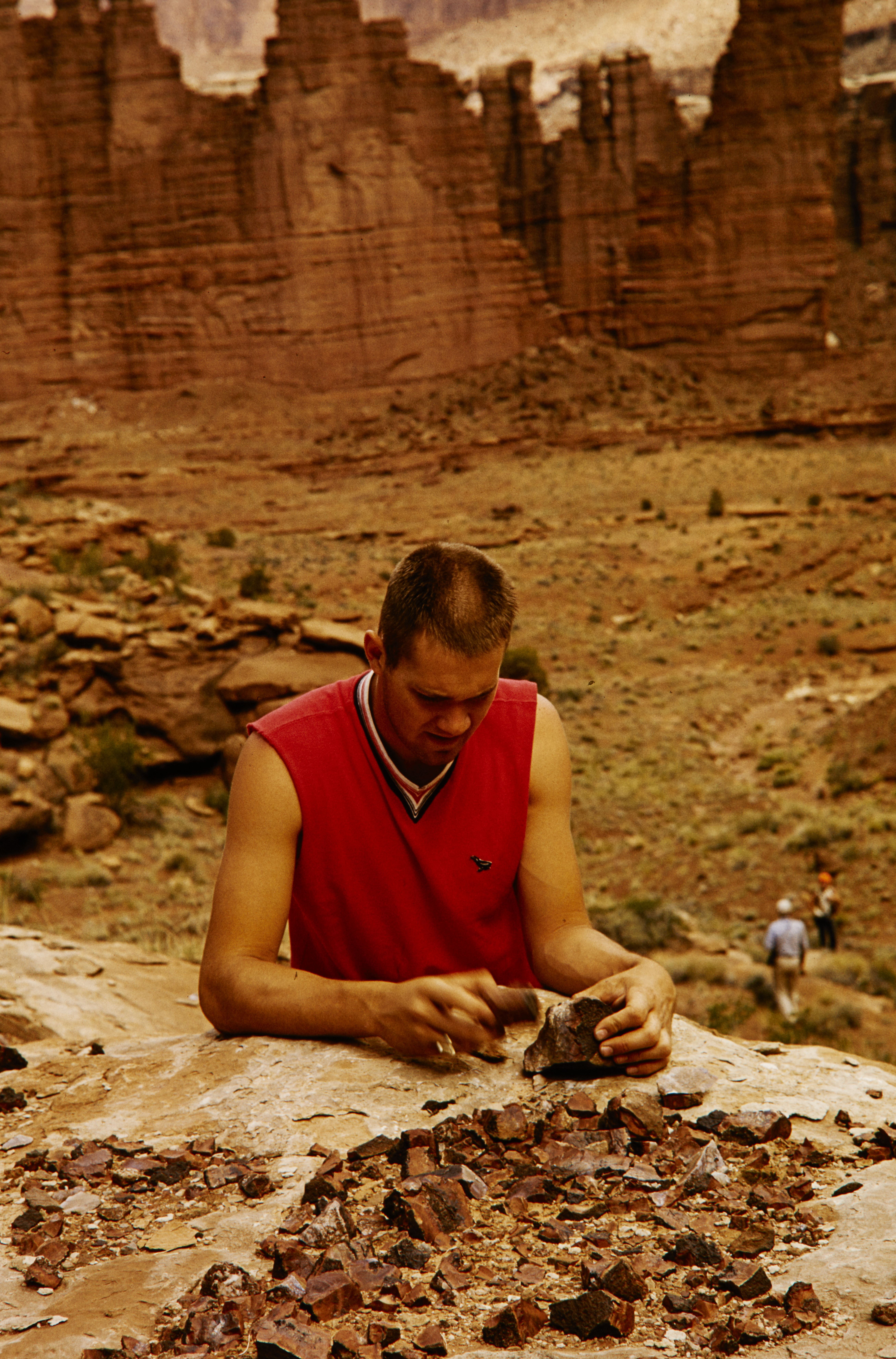 Man chipping two rocks together in Standing Rock Basin in Canyonlands National Park.