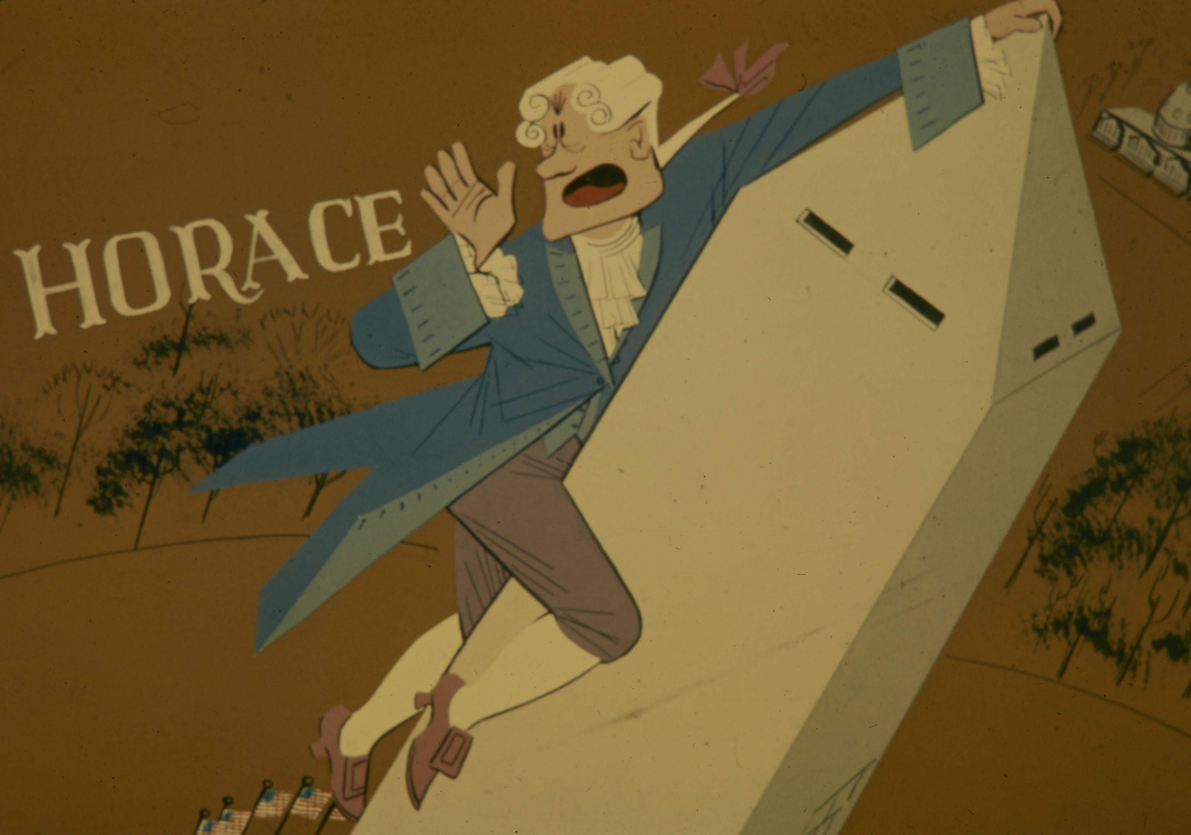 Photoslide cartoon of a man in a 1700s outfit yelling atop the washington monument. The name "HORACE" is also in the serving as a reference to Horace Albright.