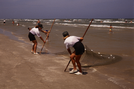 NPS employee pulling in a net on the beach at Padre Island National Seashore.