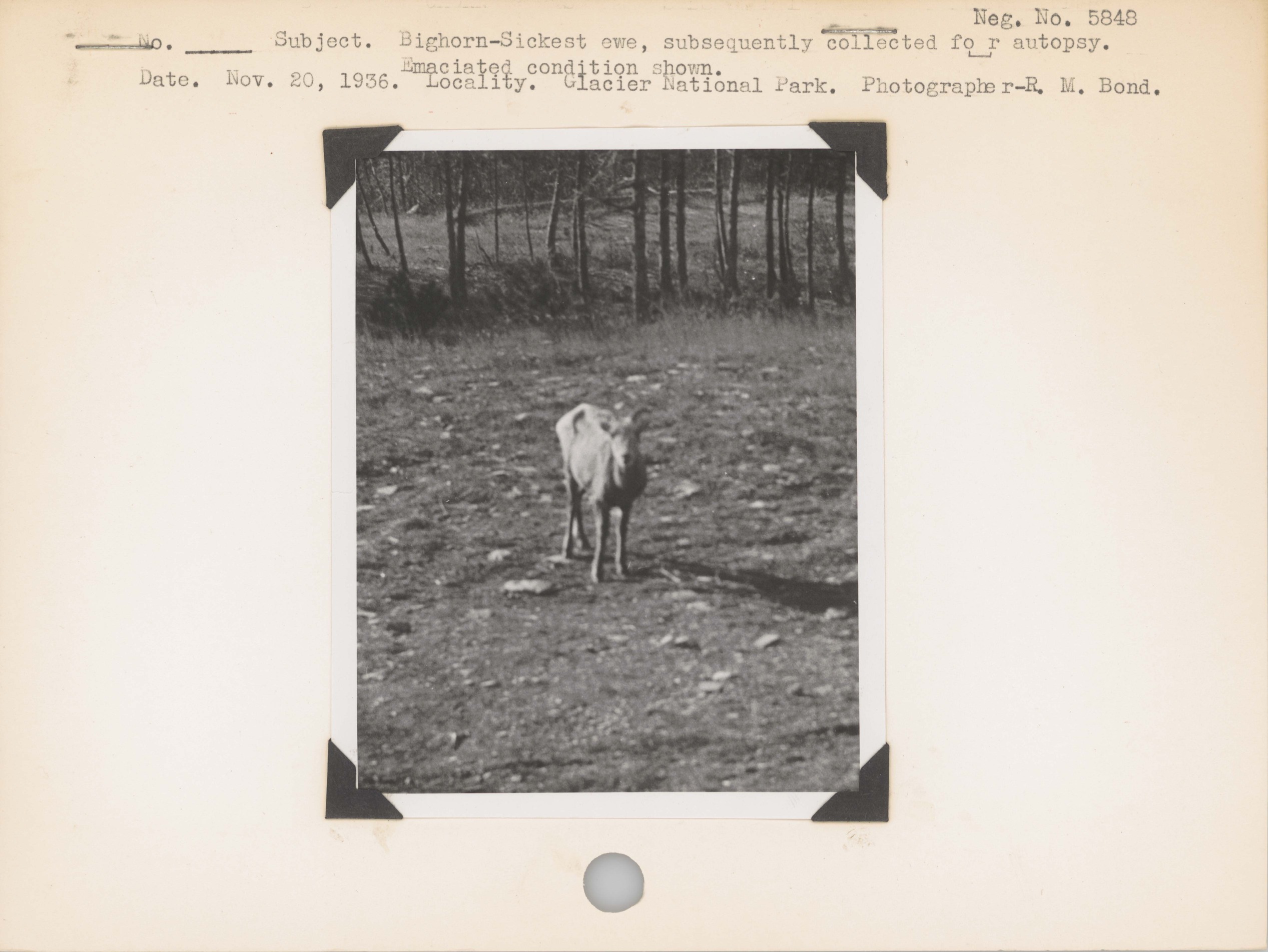 Bighorn--Sickest ewe, subsequently collected for autopsy. Emaciated condition shown. Locality: Glacier National Park. Negative #: 5848