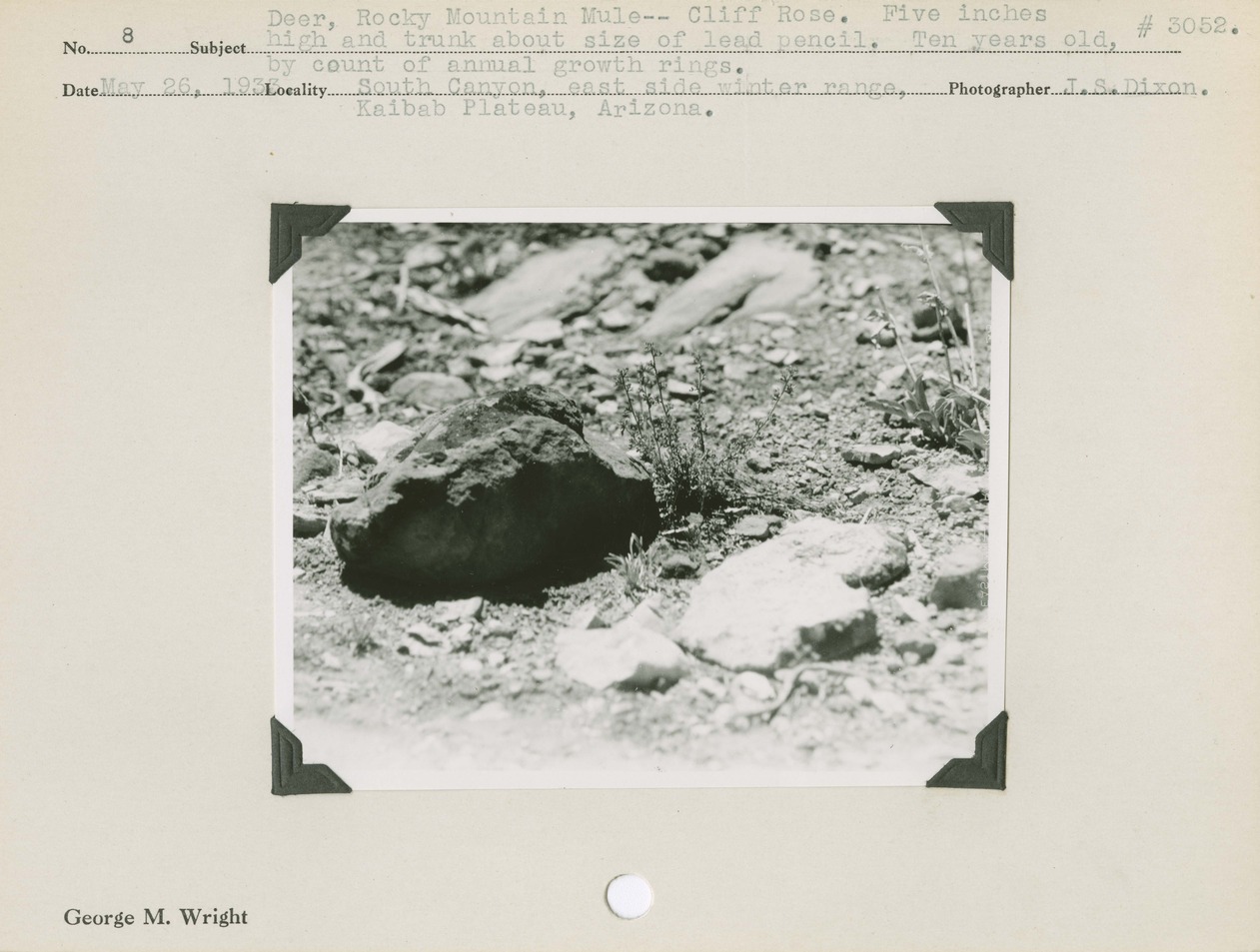 Deer, Rocky Mountain Mule: Cliff Rose. Five inches high and trunk about size of lead pencil. Ten years old, by count of annual growth rings. Negative #: 3052. Locality: South Canyon, east side winter range, Kaibab Plateau, Arizona.