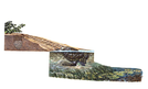 Sea turtle nest employing above and below waterline technique and a cut-away of nest showing the eggs, a Hawksbill female re-entering the water with grasses and schools of Grunts feeding on the reef.