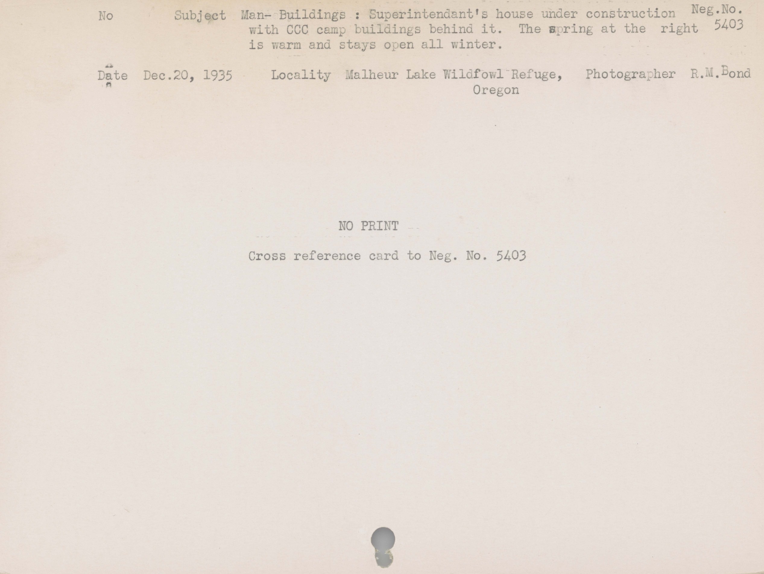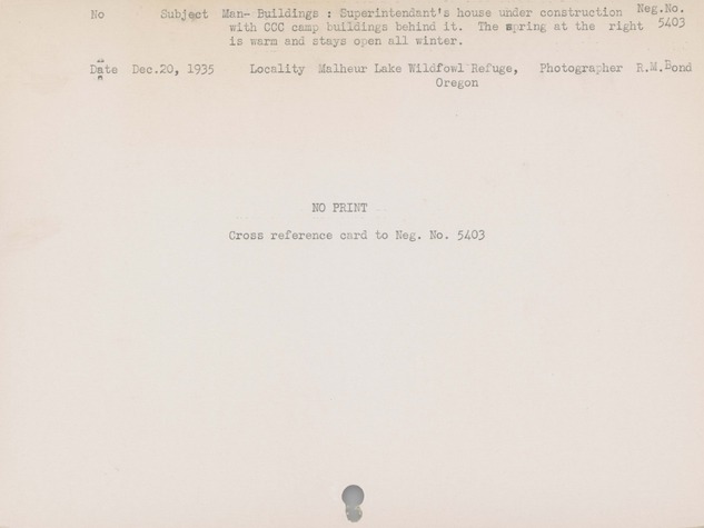 Man--Buildings--Superintendant's house under construction with CCC [Civilian Conservation Corps] camp buildings behind it. The spring at the right is warm and stays open all winter. Locality: Malheur Lake Wildfowl Refuge, Oregon. Negative #: 5403. No Print . Cross reference card to Negative #5403
