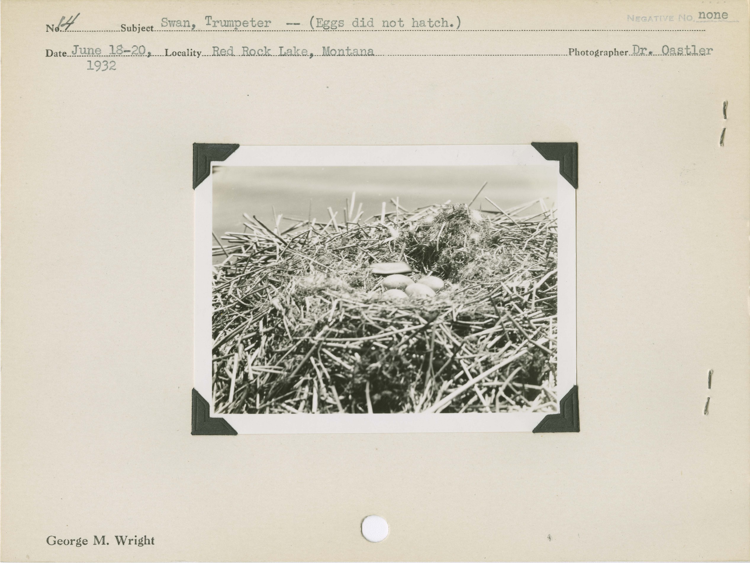 Swan, Trumpeter (Eggs did not hatch). Locality: Red Rock Lake, Montana. No negative on file