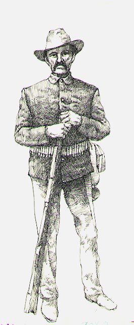 Full standing figure of a United States Infantryman, c1870s, wearing a cartridge belt with other items hanging from the belt on the figure's left and holding an ill defined rifle.
