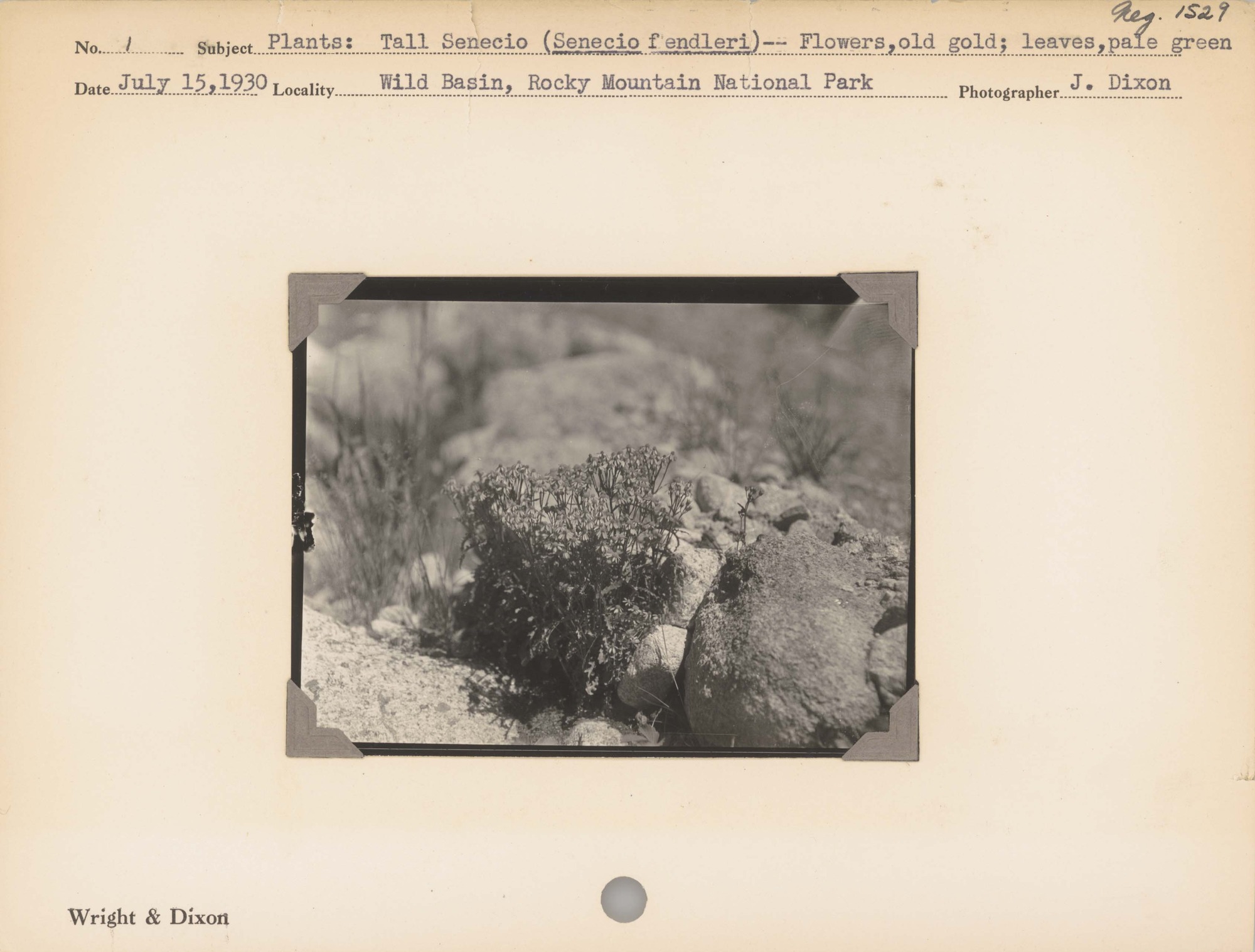Plants--Tall Senecio (Senecio fendleri)--Flowers, old gold; leaves, pale green. Locality: Wild Basin, Rocky Mountain National Park. Negative #: 1529.