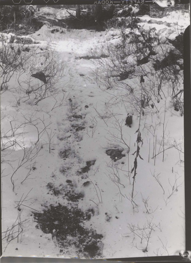 Trail of 20 or 30 elk migrating around head of Moran Bay. Negative #: 11,053. Locality: Grand Teton National Park. Location of Negative: Biologist’s Office, Director’s Office. [This information comes from the reverse of the envelope for this negative number.].