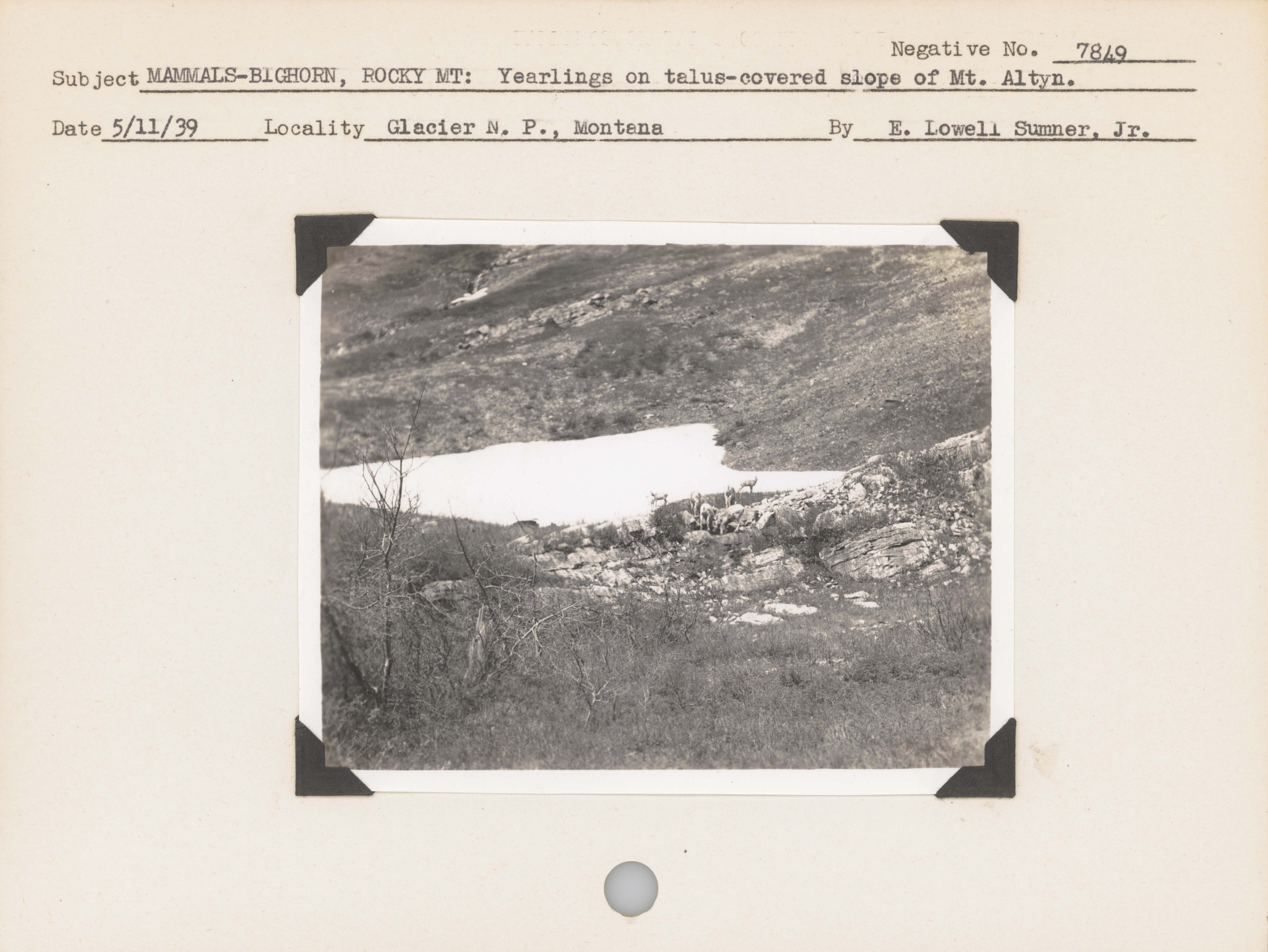 Mammals--Bighorn, Rocky Mountain--Yearlings on talus-covered slope of Mount Altyn. Locality: Glacier National Park, Montana. Negative #: 7849