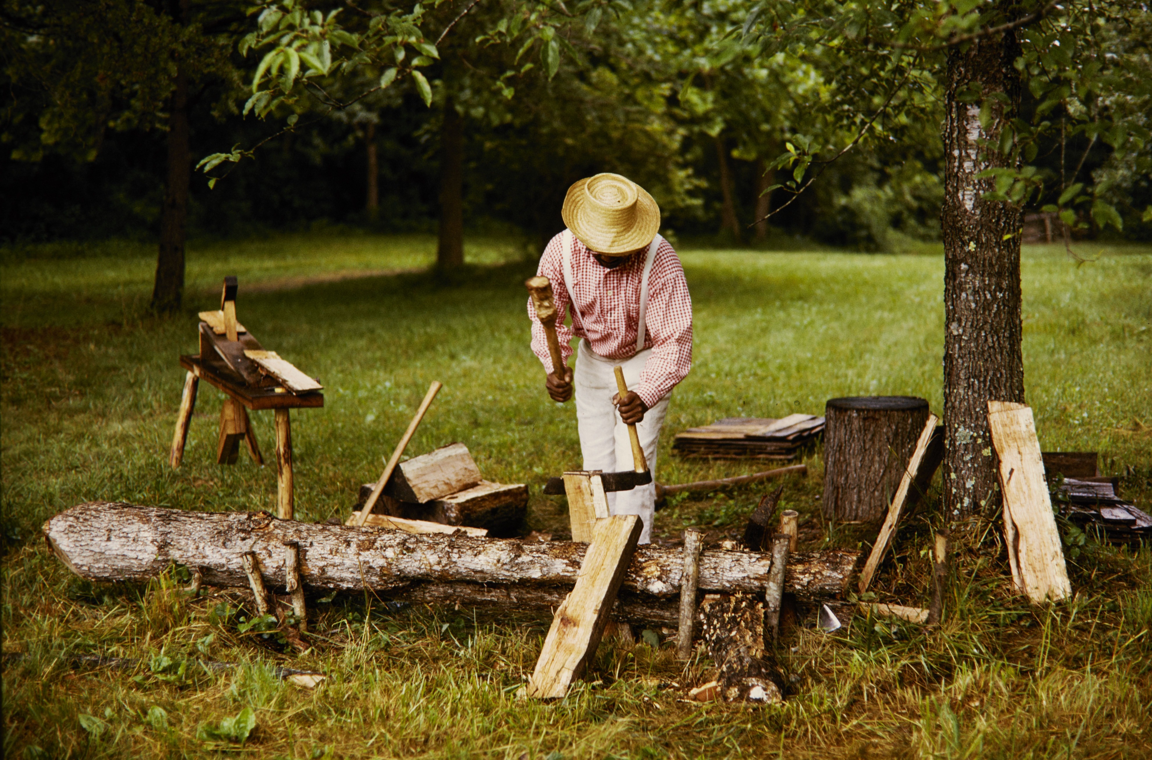 Man chopping wood at Booker T. Washington National Monument. Image Number 74-1689-25.