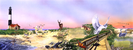 Barrier Island profile: Illustrated compressed panorama of ocean/beach, dune/forest, and marsh/bay habitats representing the interdependence of the ecological zones