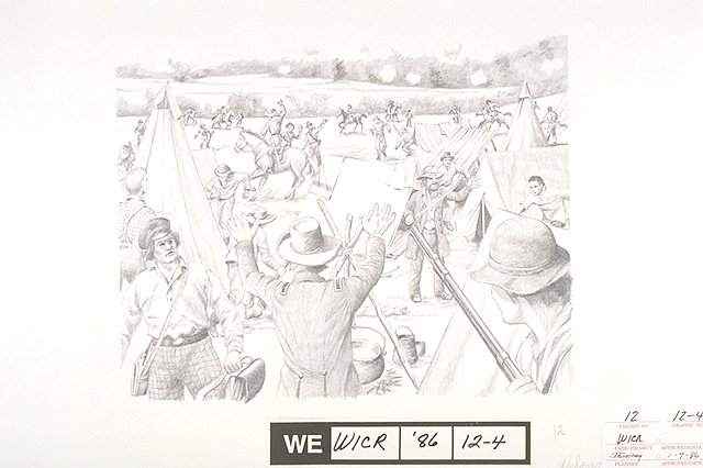 Scene depicts the opening of the Battle of Wilson's Creek as seen from behind the Edwards Cabin looking up toward Bloody Hill. Shown is the confusion of the Confederates in camp, and the attempt by officers to organize the men for battle.
