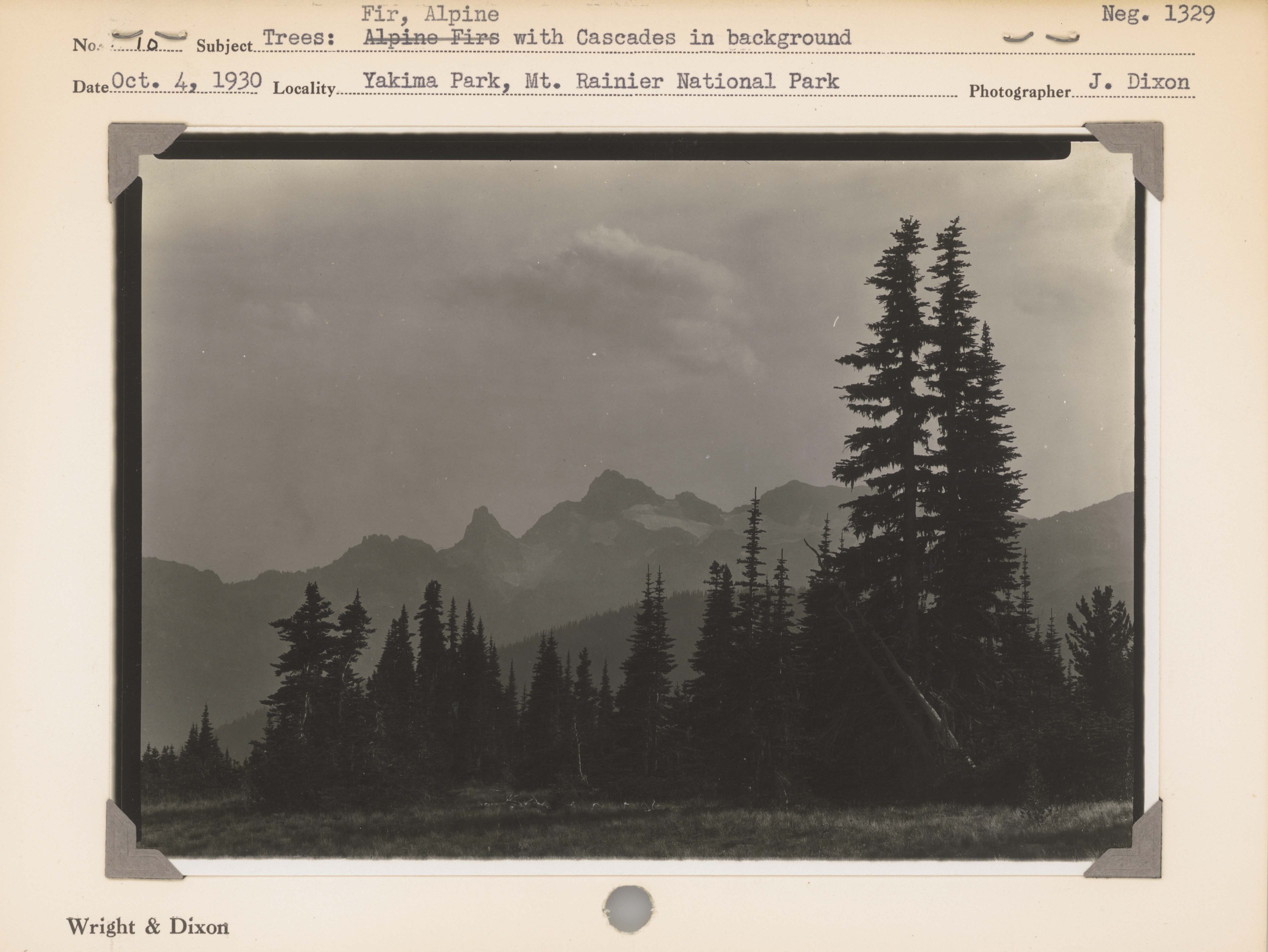 Trees: Fir, Alpine with Cascades in background. Negative #: 1329. Locality: Yakima Park, Mount Rainier National Park.