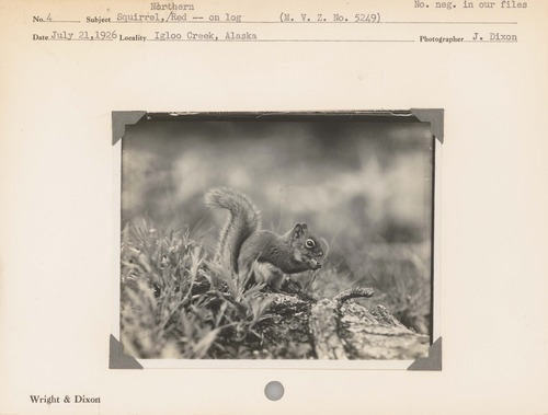 Squirrel, Northern Red--on log. Locality: Igloo Creek, Alaska [Denali National Park & Preserve]. Negative #: mvz5249. [UC Museum of Vertebrate Zoology]. No negative in our files