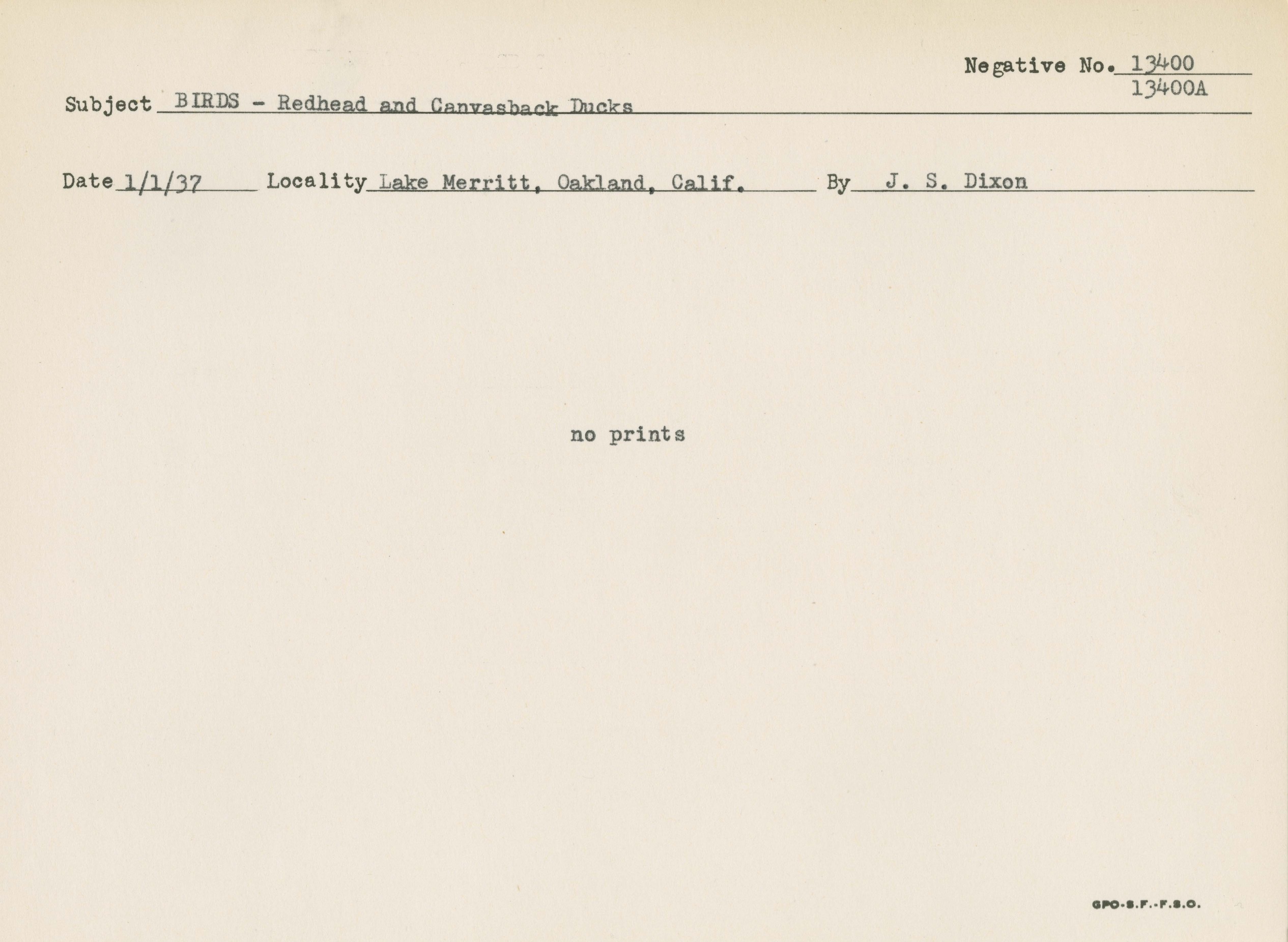 Birds - Redhead and Canvasback Ducks. Locality: Lake Merritt, Oakland, California. Negative #: 13400. [Photo card has no image]