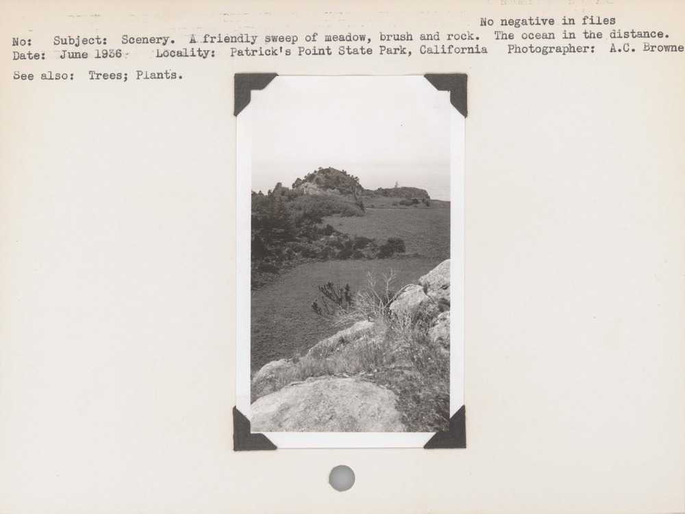 Scenery – A friendly sweep of meadow, brush and rock. The ocean in the distance. See also: Trees; Plants. No negative on file. Locality: Patricks Point State Park, California.