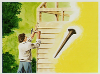 Handmade iron nail superimposed over a man hammering nails. Wooden pegs or treenails were used to hold constructions together but iron nails were vital for fixing the clapboard on the exterior.