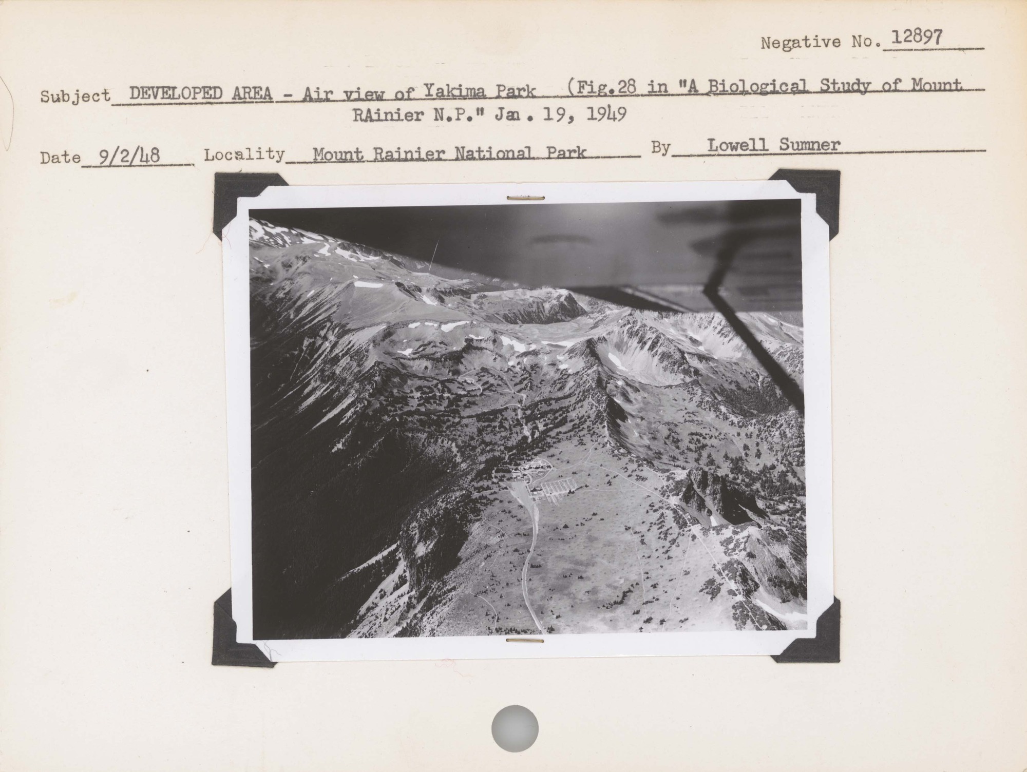 Scenery – Air View of Yakima Park. (Figure 28 in “A Biological Study of Mount Rainier National Park” January 19, 1949). Negative #: 12897. Location: Mount Rainier National Park.