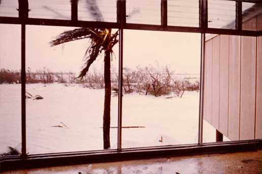 Approximately 12 noon. Water level 8 feet above mean low tide. Damage to vegetation apparent by mangrove thicket in foreground. Plate glass windows gone between museum and offices at Everglades National Park. (Hurricane Donna).