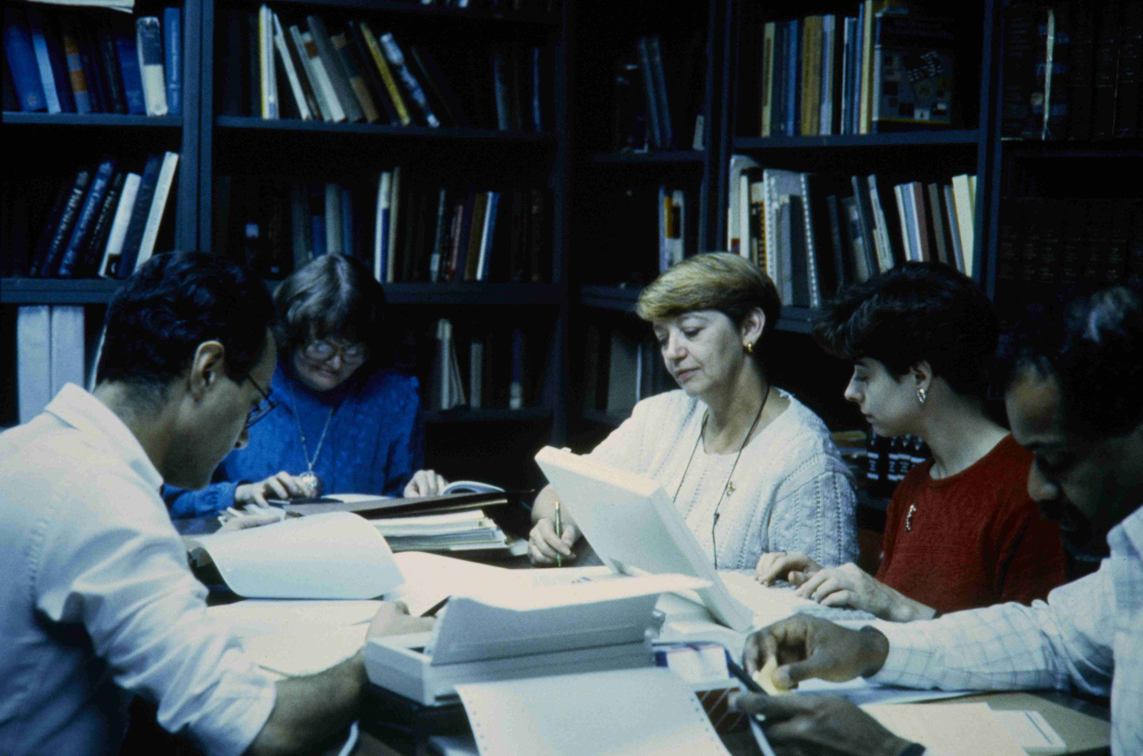 NPS employees looking at paperwork surrounded by bookshelves.