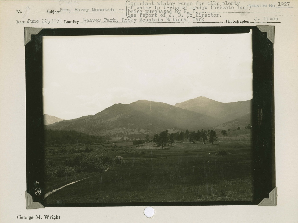 Elk, Rocky Mountain – Important winter range for elk; plenty of water to irrigate meadow (private land) being purchased by N.P.S. See report of Joseph Dixon to Director. Negative #: 1927. Locality: Beaver Park, Rocky Mountain National Park.