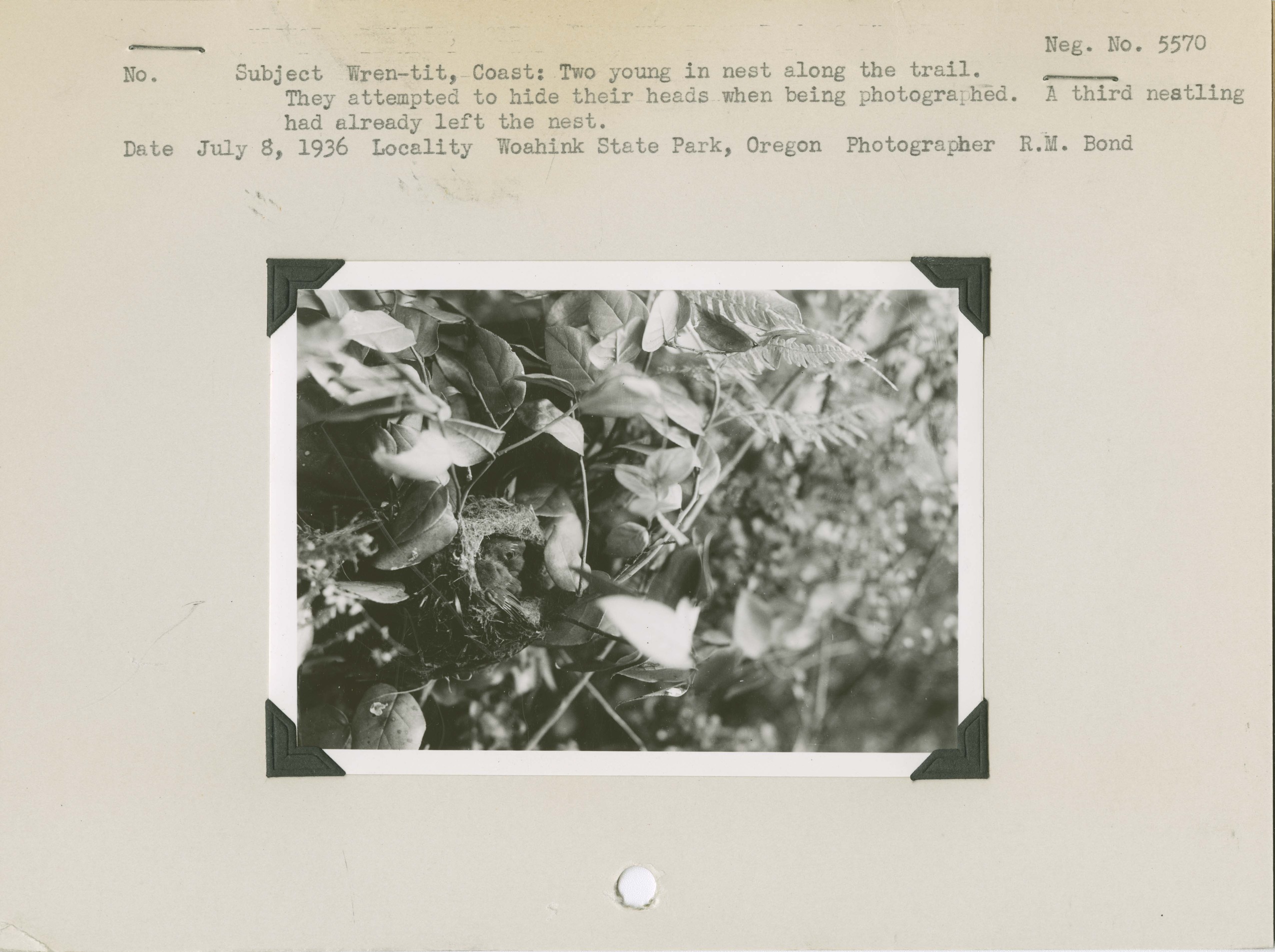 Wren-tit, Coast: Two young in nest along the trail. They attempted to hide their heads when being photographed. A third nestling had already left the nest. Locality: Woahink State Park, Oregon. Negative #: 5570