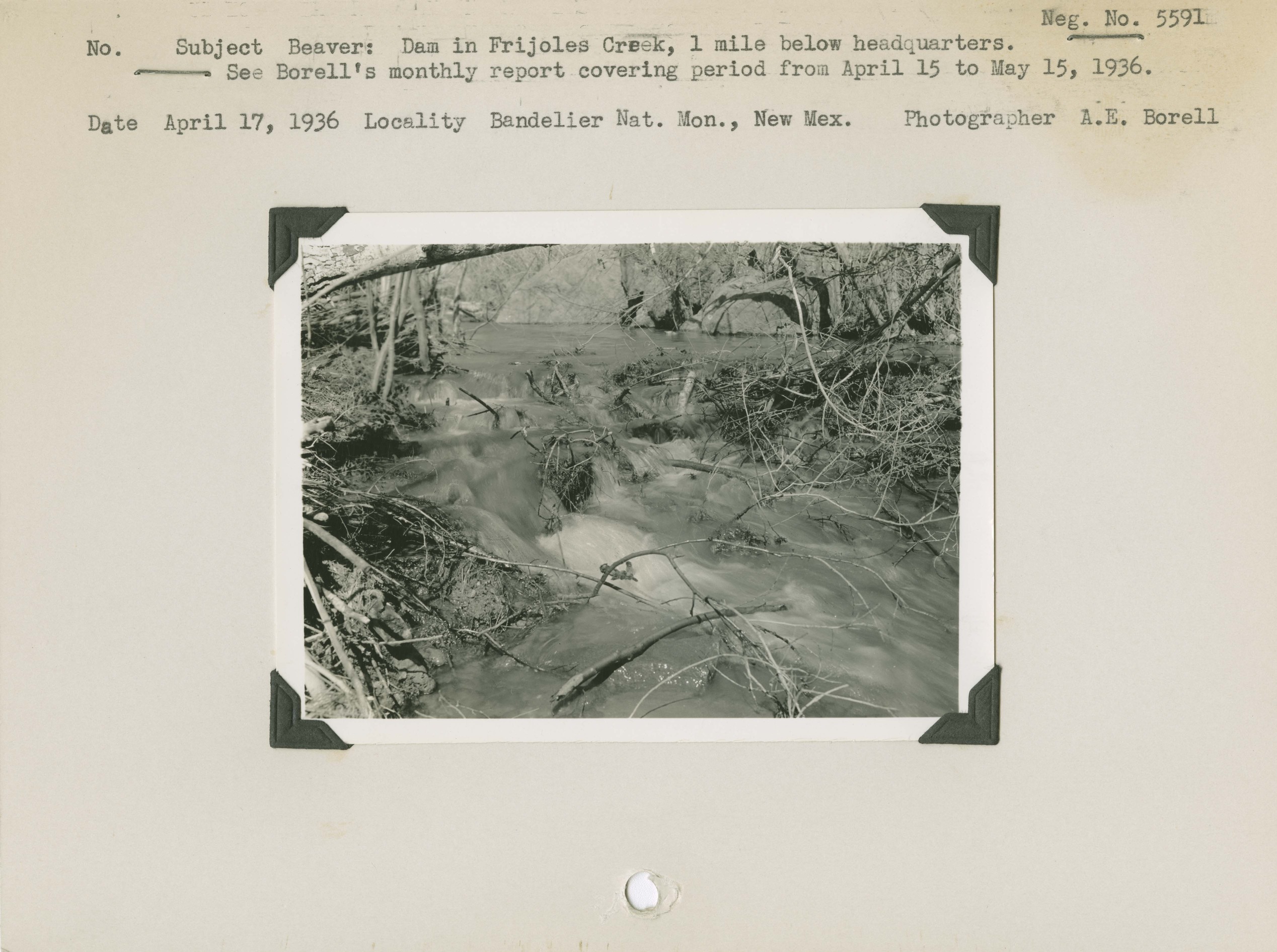 Beaver: Dam in Frijoles Creek, 1 mile below headquarters. See Borell’s monthly report covering period from April 15 to May 15, 1936. Locality: Bandelier National Monument, New Mexico. Negative #: 5591.