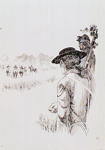 Spectators in foreground looking down on Lieutenant Colonel William Washington's dragoons charging down slope into the ranks of the British guards and grenadiers.